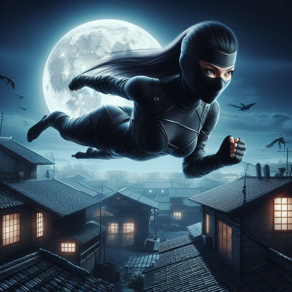 "Can you please draw a picture of a female ninja wearing a skintight bodysuit and flying over rooftops on a full moon night?"