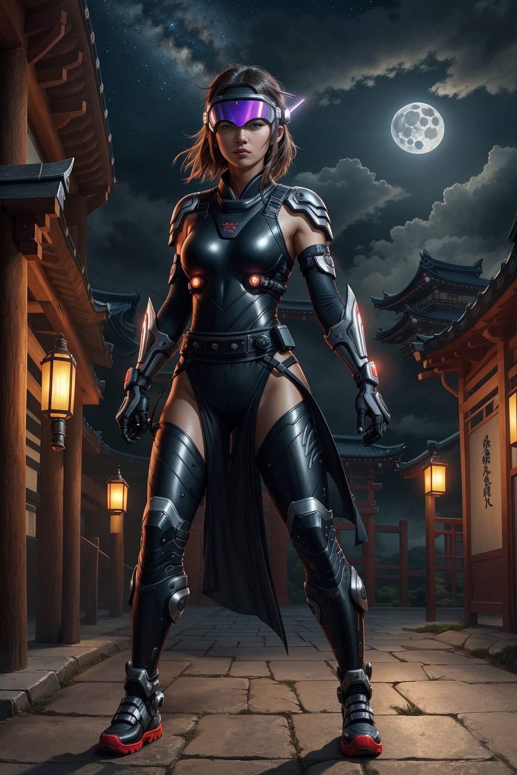 1girl, full body shot, japanese ninja, japanese woman, Design a futuristic Japanese female ninja warrior with a high-tech costume, The outfit should be sleek and metallic, with neon accents Add robotic enhancements like cybernetic limbs or an augmented reality visor, background of japanese old castle, night, night sky, full moon, clouds, candle lamps, pavilion, (masterpiece:1.3), extremely high details, realistic, (best quality:1.3), absurdres, high resolution, hyper-detailed, ray-tracing, sharp focus, vibrant, intricate, sharpness and clarity