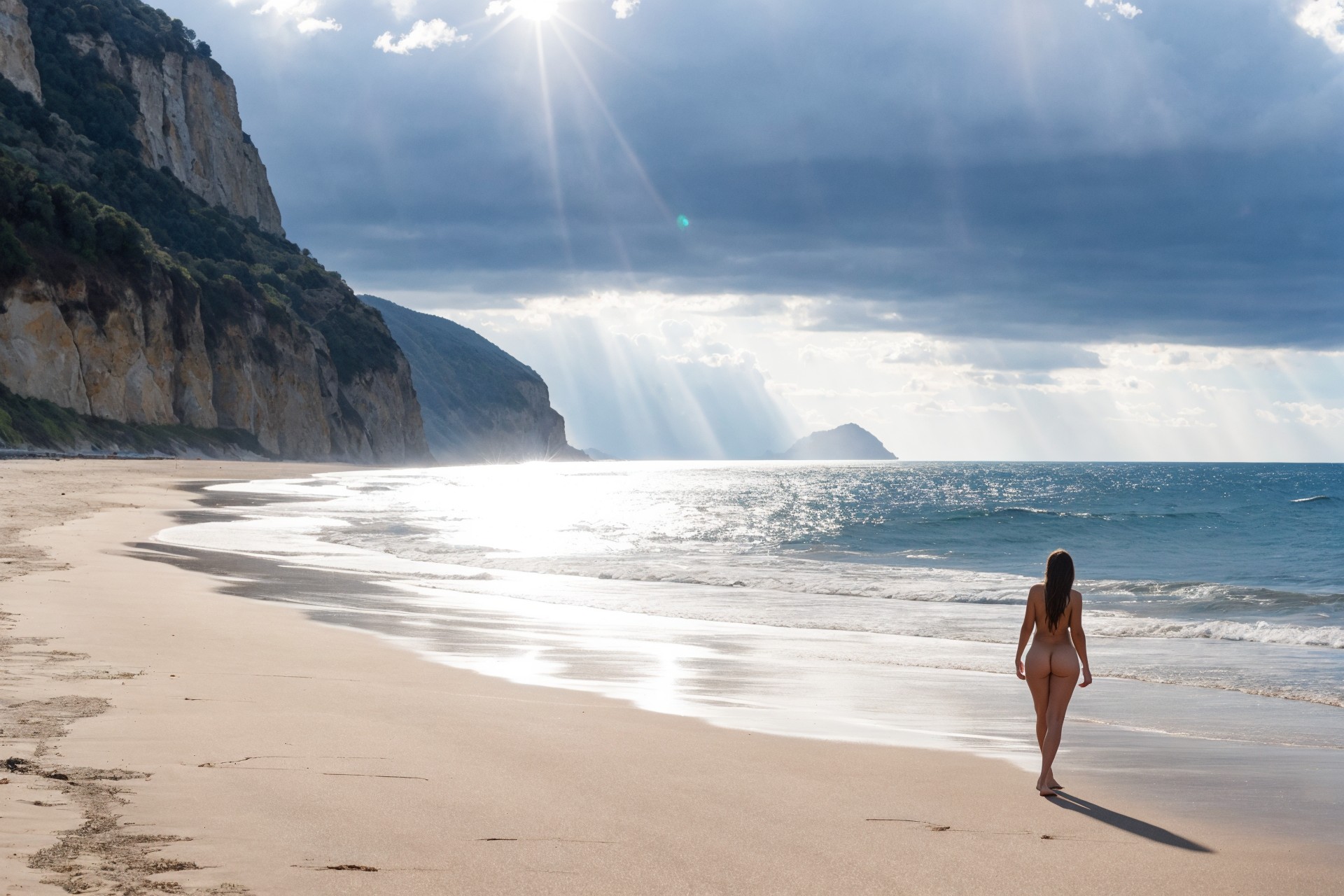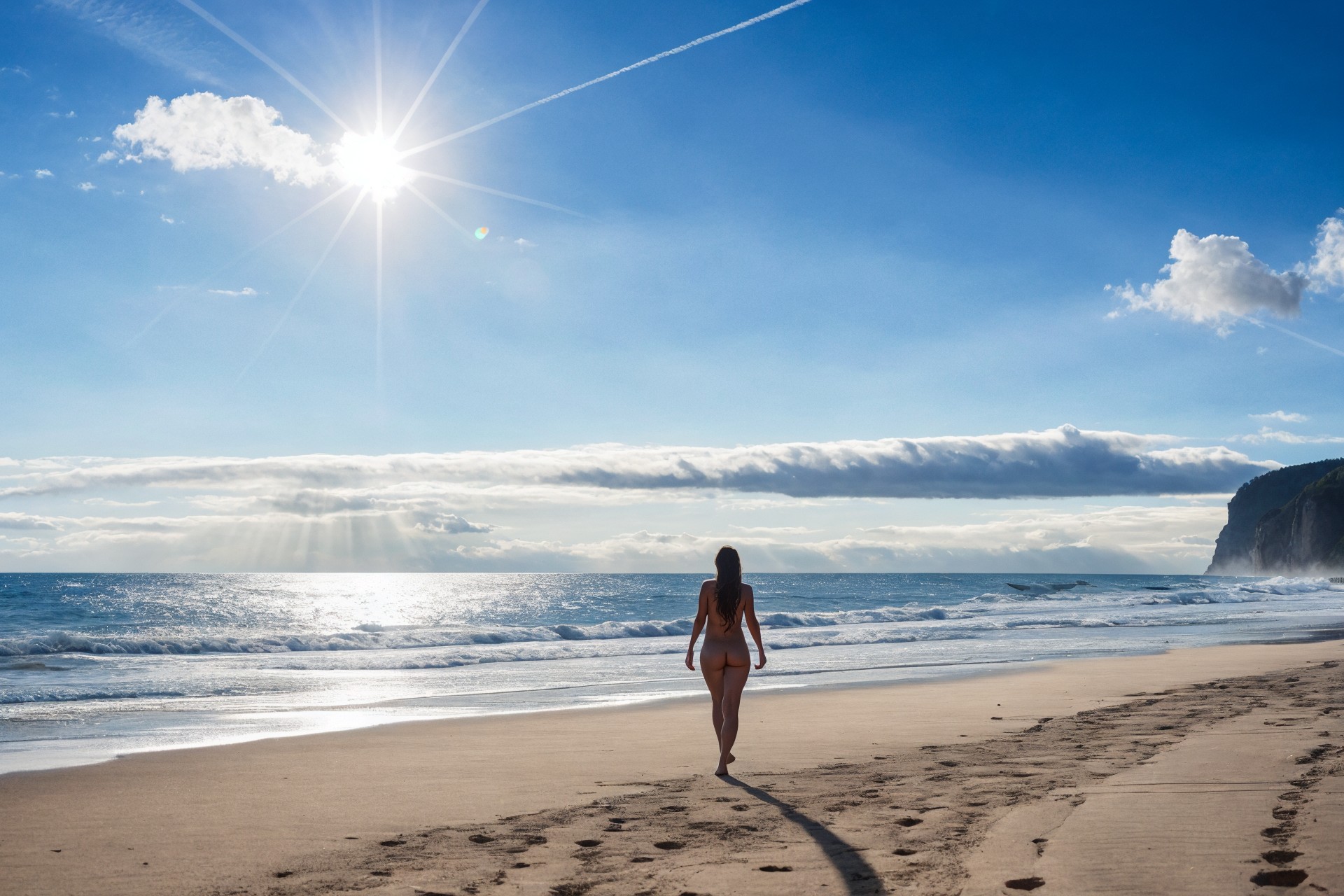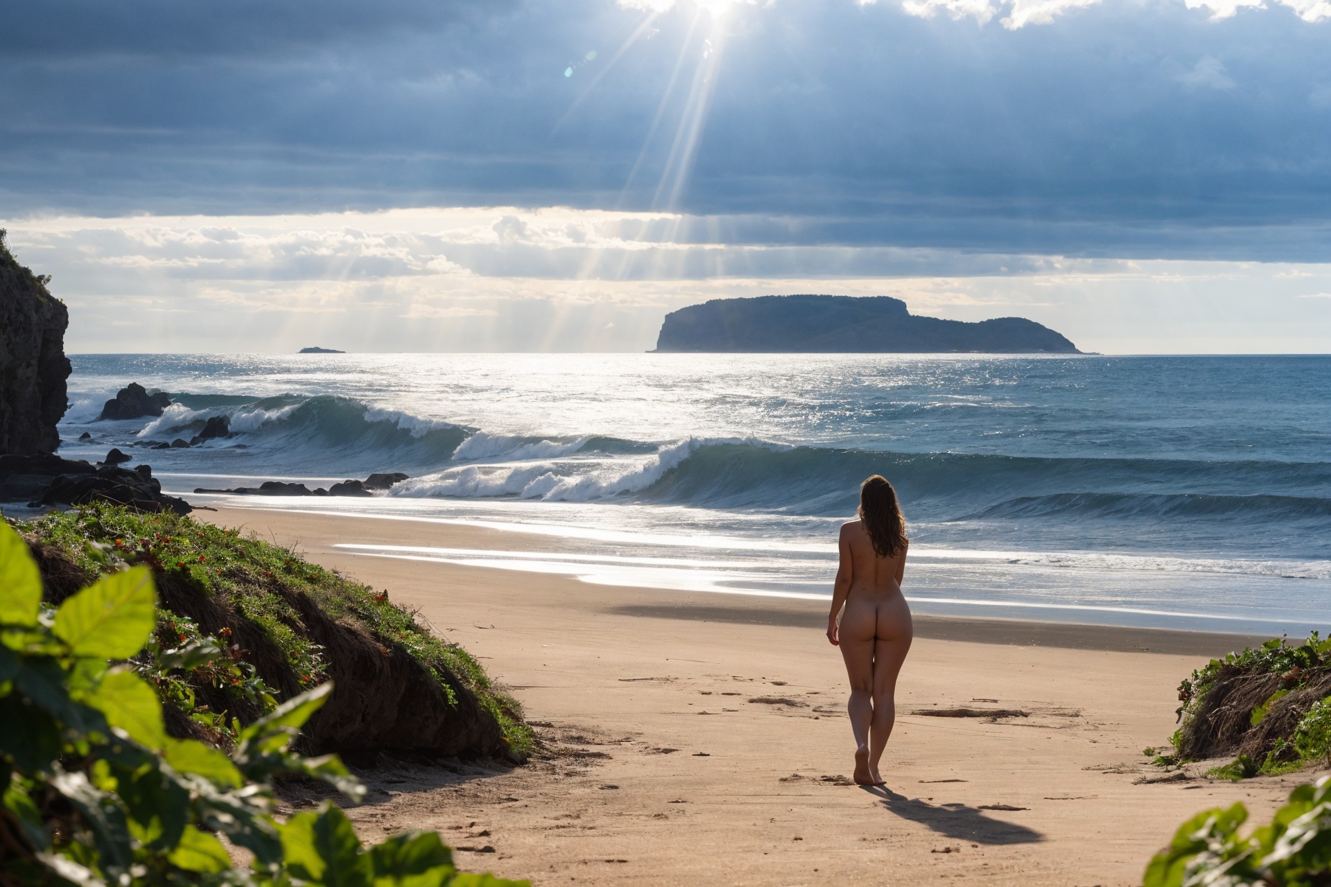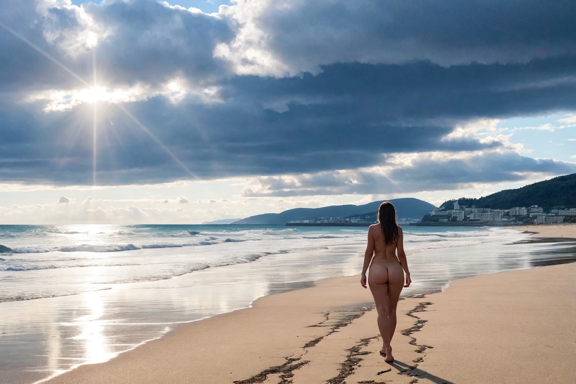 1girl, (full body:1.3), distance view from behind of naked girl walking on rainy beach, silhouette, storm cloud on sky, thick thigh, huge asses, wide hip, bare foot, raining, (masterpiece:1.3), (best quality:1.3), extremely high details, absurdres, (photorealistic), realistic, hyper-detailed, ray-tracing, high resolution, sharp focus, 8k, vibrant, intricate, sharpness and clarity, lifelike, hyper_realism
