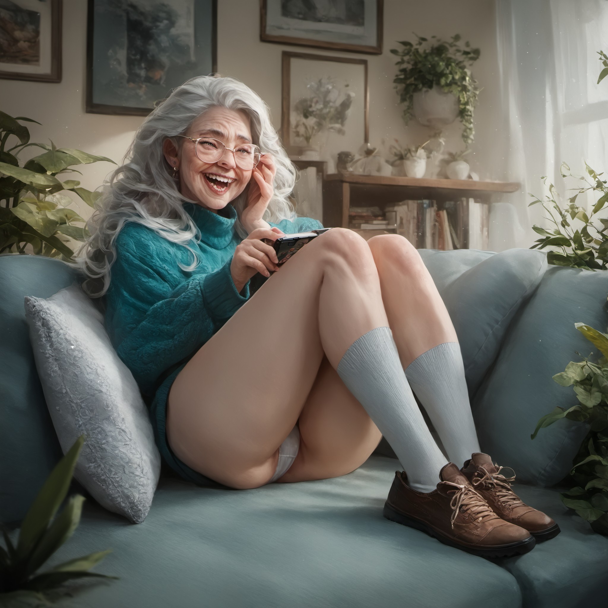 score_9, score_8_up, score_7_up, score_6_up, score_5_up, score_4_up, nsfw, an old woman is masturbating with dildo on couch in living room at home, inserting huge dildo into vagina, blush, lift-up skirt, big breasts, spread legs, looking away, big fat pussy, bare thighs, socks, puffy cameltoe, shoes, female pubic hair, closed eyes, open mouth, uncensored, plants, view from front, <lora:Expressive_H:1> Expressiveh <lora:Concept Art Brush Style LoRA_Pony XL v6:1> concept art, digital art, realistic,, (best quality:1.3), high details, high resolution