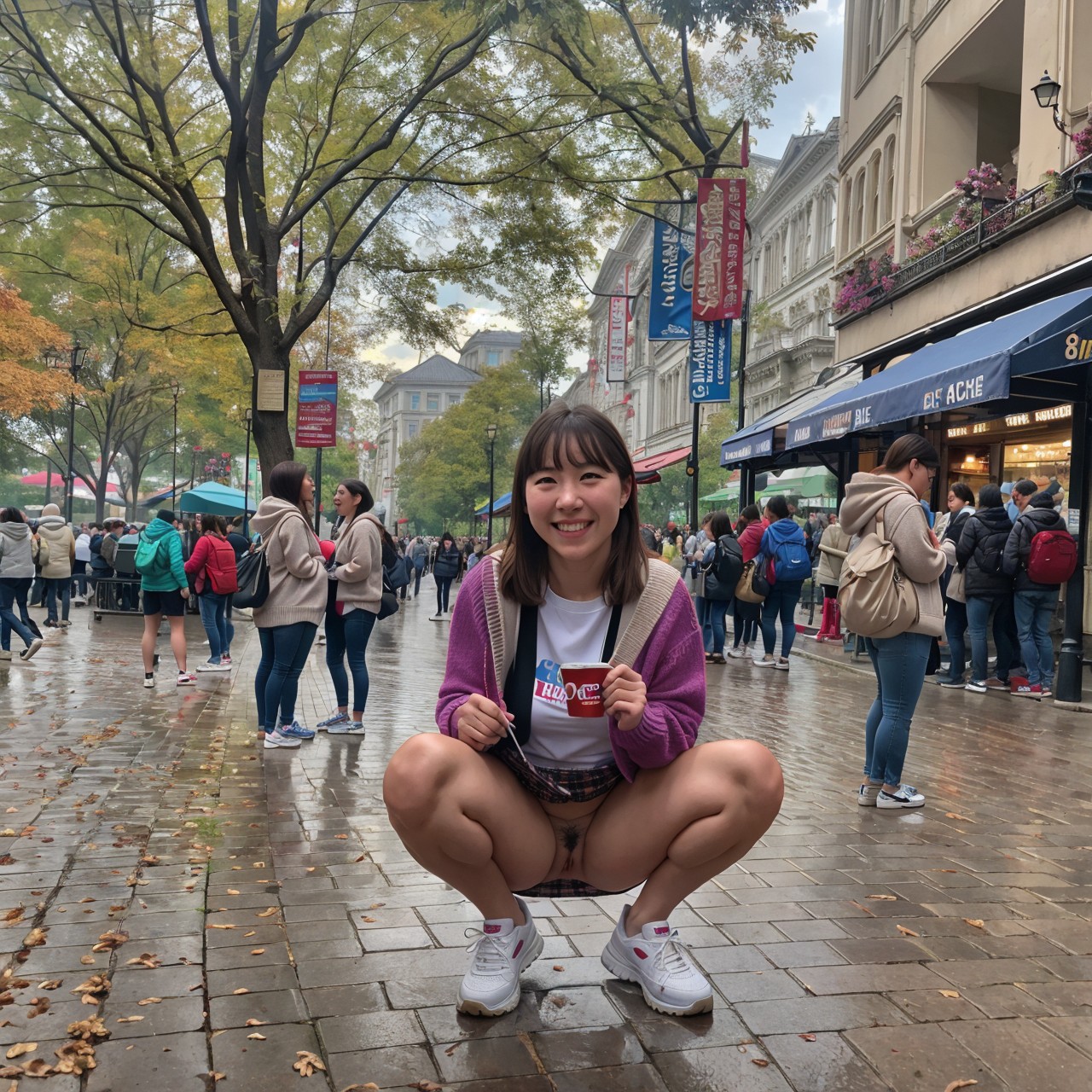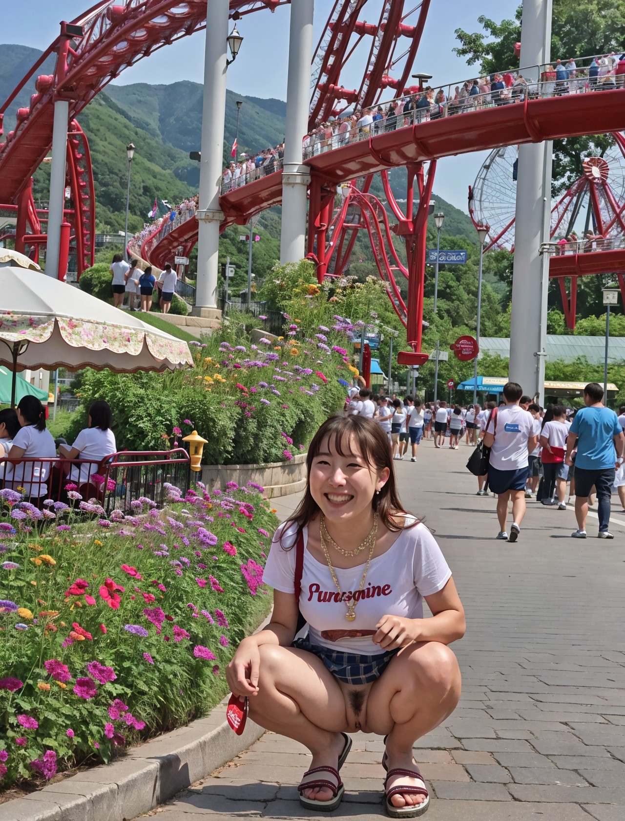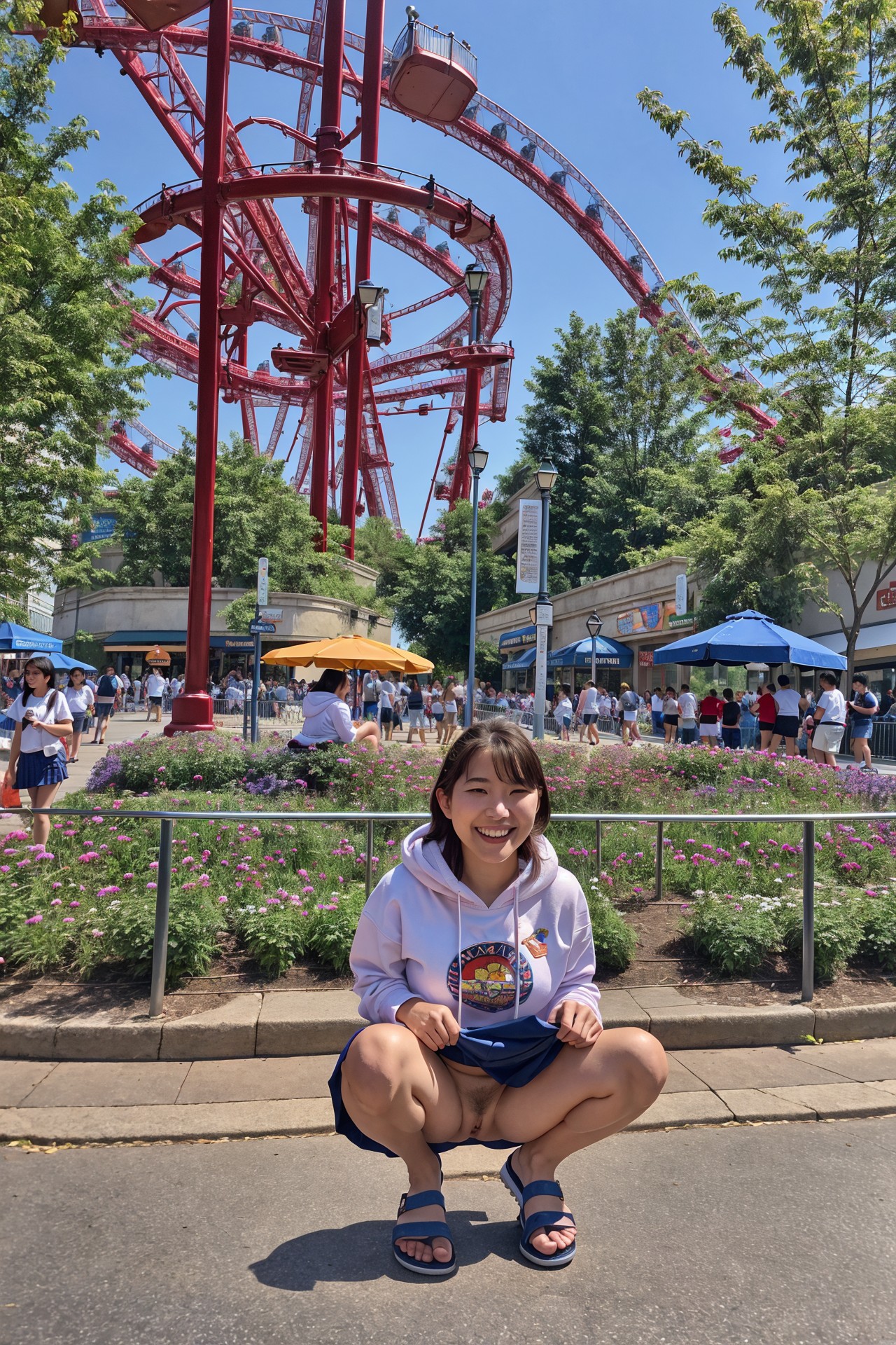 crowd theme park, asian girl squatting down on curbside in crowd theme park, roller coaster, 1girl, (full body:1.3), smile512, necklace, looking away, baggy shirt, sandals, medium boobs, skirt, public flash, exhibitionism, exposed pussy, (pubic hair:1.3), crowd park, so many people around, kids playing, depth of field, skirtlift, lift skirt, <lora:skirtlift-v4:0.7>, day, sun, <lora:zoom_slider_v1:-4>, parade in theme park, <lora:zoom_slider_v1:-3>, (masterpiece:1.3), (best quality:1.3), extremely high details, absurdres, (photorealistic), realistic, hyper-detailed, ray-tracing, high resolution, sharp focus, 8k, vibrant, intricate, sharpness and clarity, lifelike, hyper_realism
