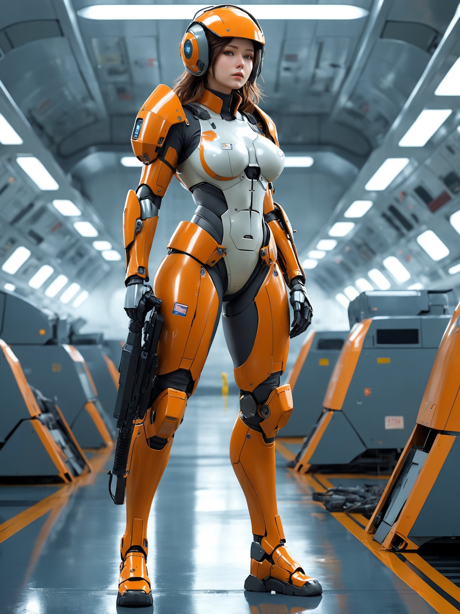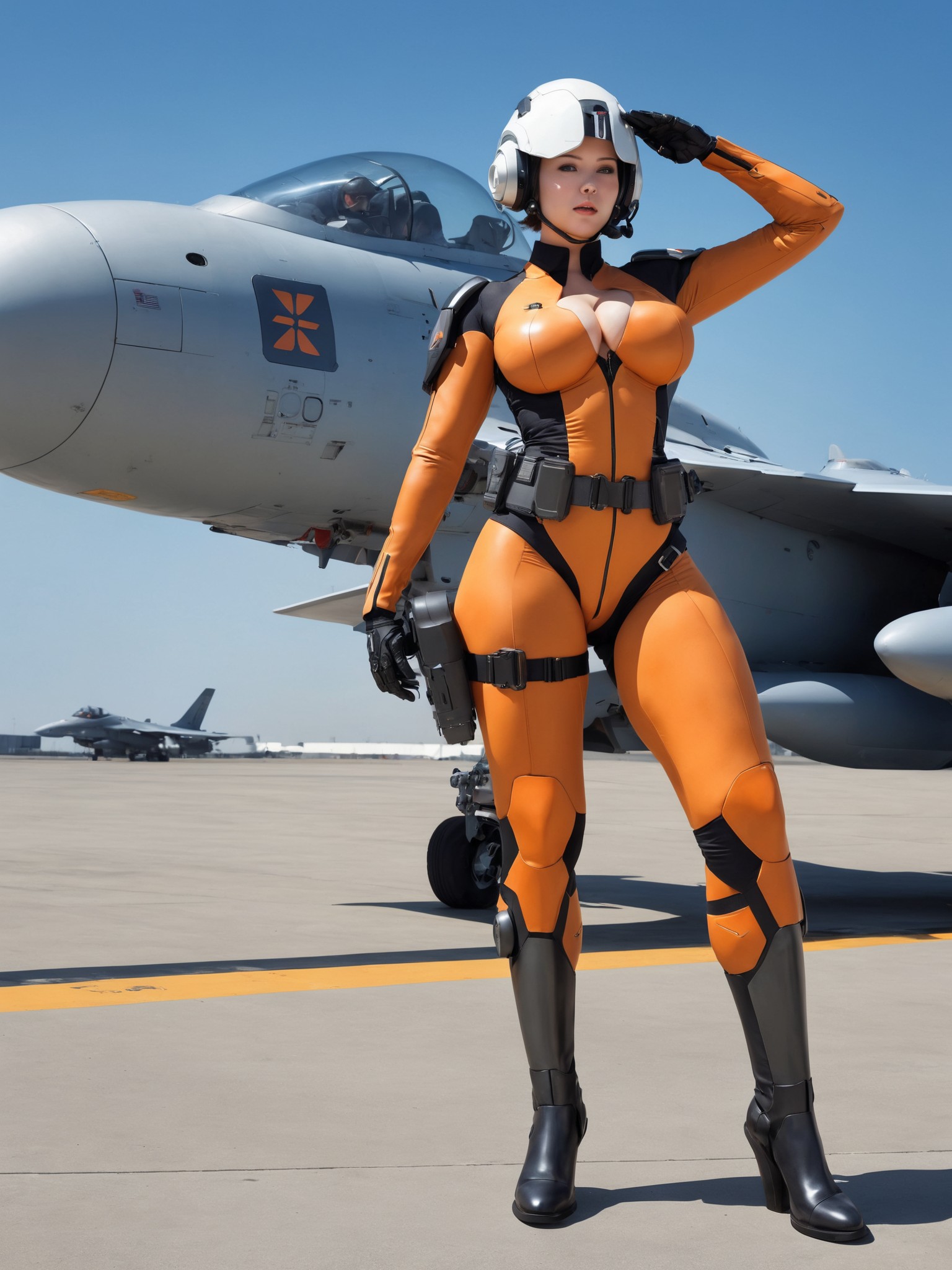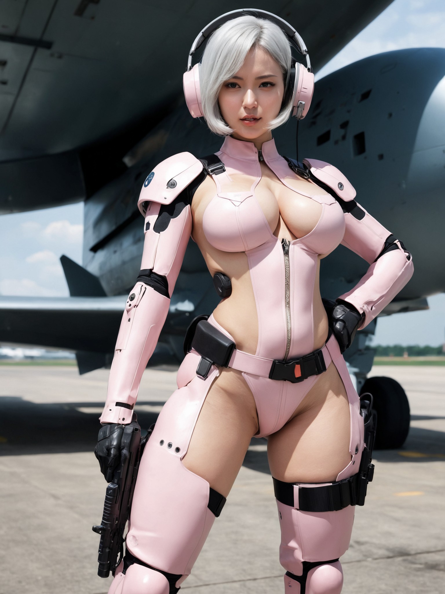 nsfw, full body, a woman busily working near futuristic aircrafts in the year 3000 at emergency situation, pose of balancing with outstretched arm gesture, huge boobs, thick legs, gray hair color, background of military facility, wear shoulder robo suit, pink theme suit, shiny metal suit, high-tech helmet, electronic devices, waist belt, battle gears, grenades, guns, radio, jet pack, thigh belt, no chest cover, exposing half of breasts, round breasts, big asses, thick thigh, no pants, no cover on crotch, no cover on pussy, exposed crotch, no buttock cover, exposed asses, exposed pussya, big puffy cameltoe, tanned skin, <lora:MJ52:0.4>