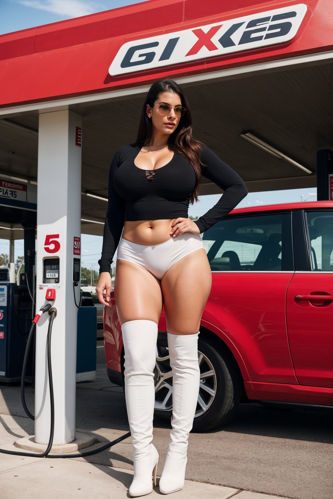 nsfw, uncensored, 1girl, full body shot, from behind, exposed butts, wearing off-shoulder, short mini-skirt, wide hips, thick thigh, white panties, knee-high socks, knee-high boots, a bag, standing in gas station, holding gas nozzle, standing next to car, sports car, suv, gas station, chevron, texaco, 76 gas station, 7-Eleven, gas pump, view from below, looking away, photography, (best quality:1.3), extremely high details, absurdres, (photorealistic), realistic, hyper-detailed, ray-tracing, high resolution, intricate, sharpness and clarity, hyper_realism