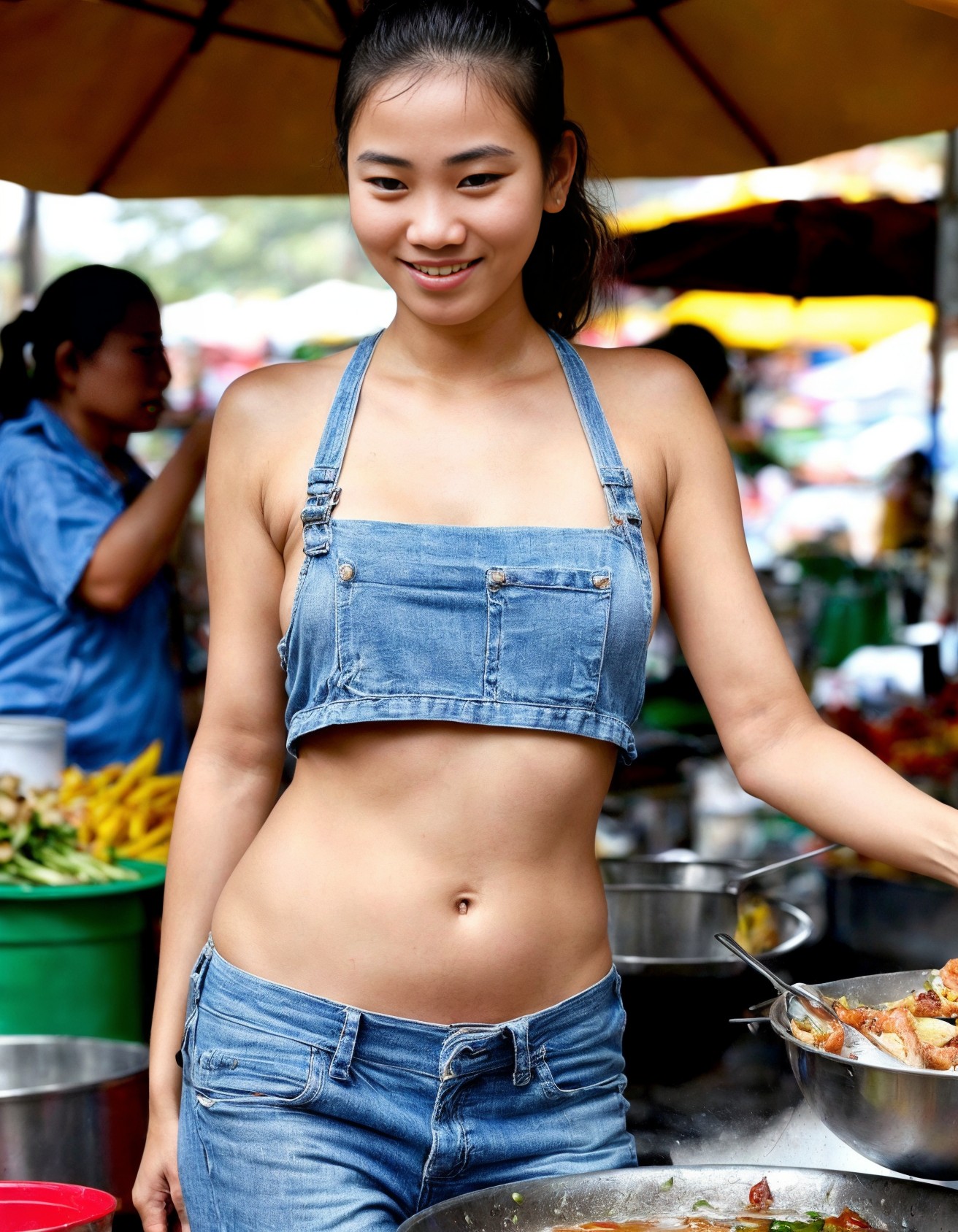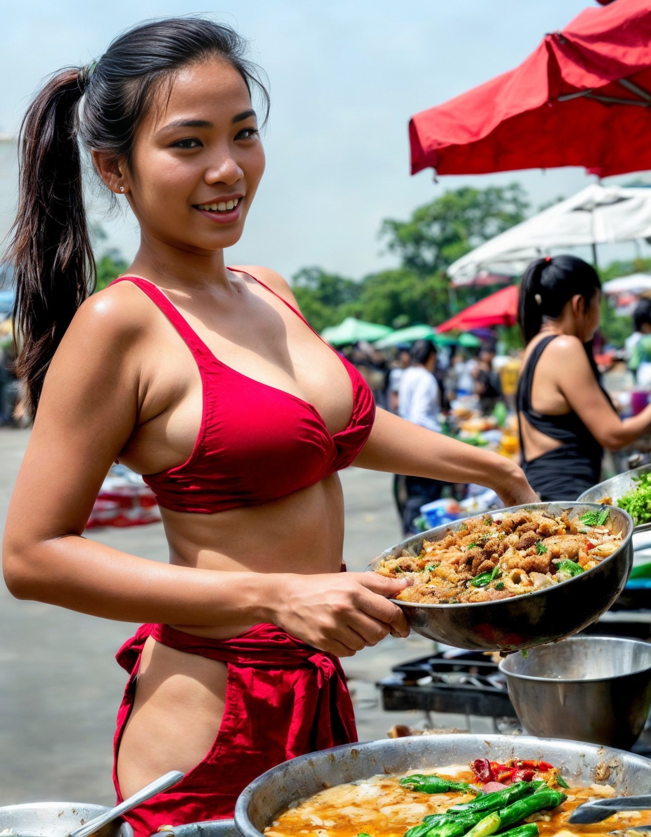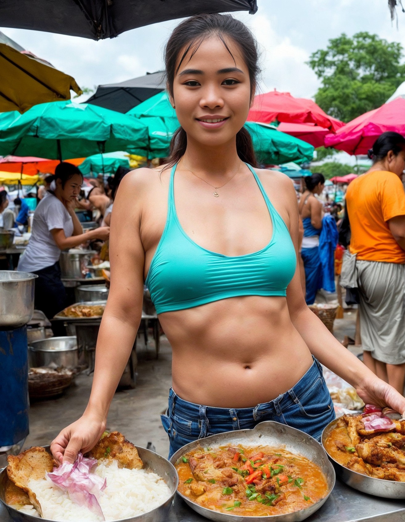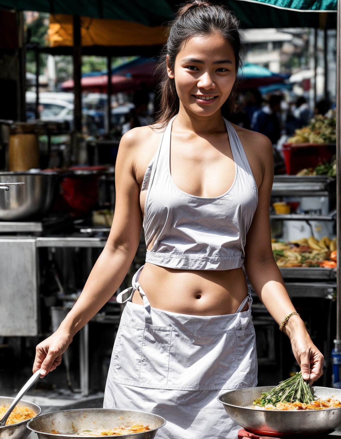 full body shot, depict a Thai girl cooking and selling food at outdoor market in Thailand, street food vendor, busy, talking, preparing food, Thai woman, food truck, busty, glamour, tanktop, apron, skimpy, ponytail hair, big breasts, sexy fashionable clothes, under-boobs, wide hip, short shots, thigh, crowd, <lora:add_detail:1>, depth of field, bokeh, (masterpiece:1.3), extremely high details, (best quality:1.3), absurdres, (photorealistic), realistic, hyper-detailed, ray-tracing, high resolution, sharp focus, 8k, vibrant, intricate, sharpness and clarity, lifelike, hyper_realism