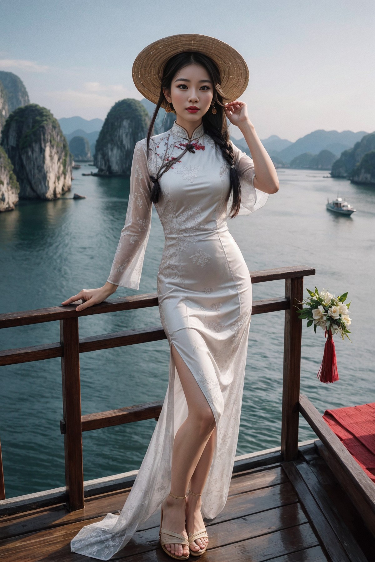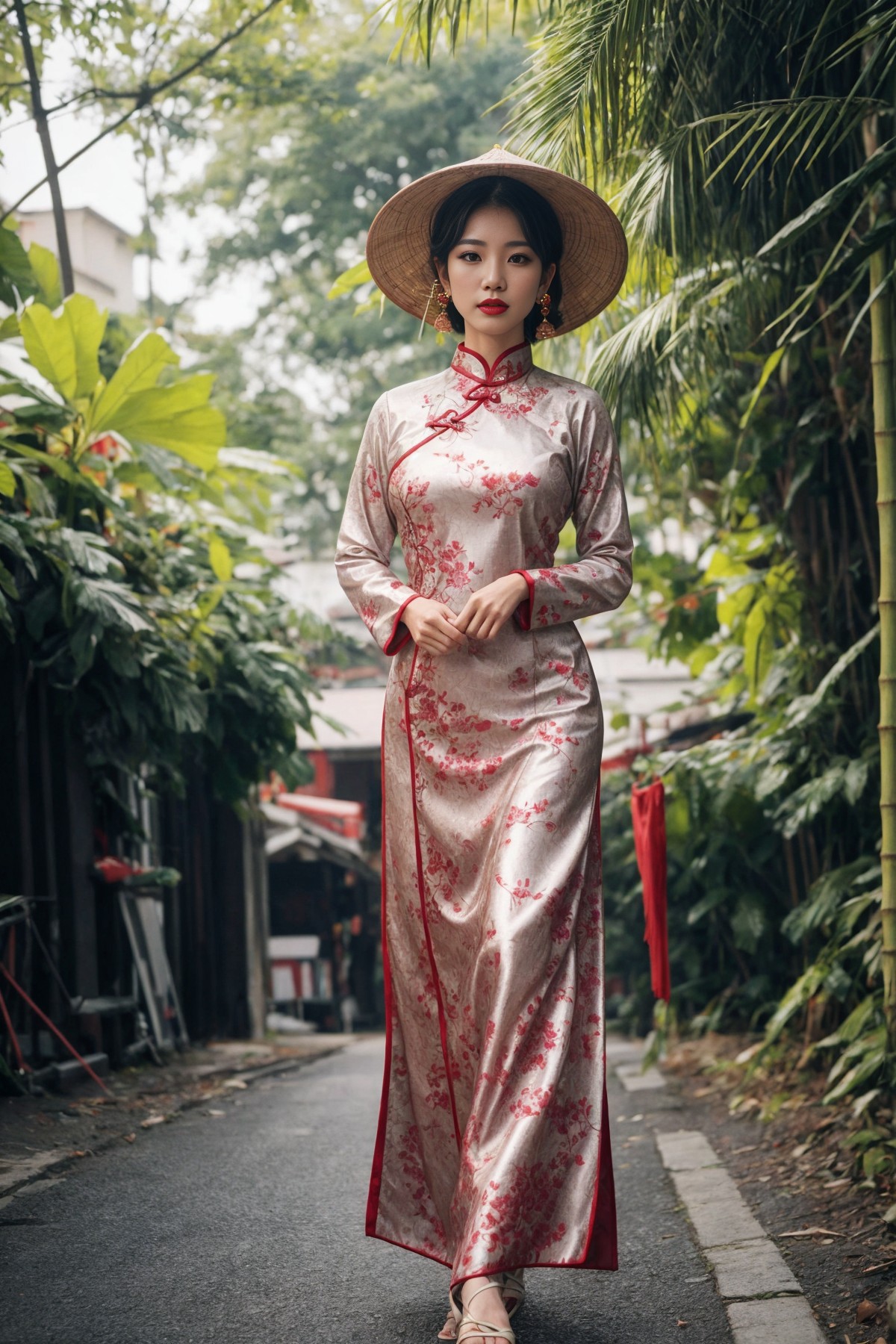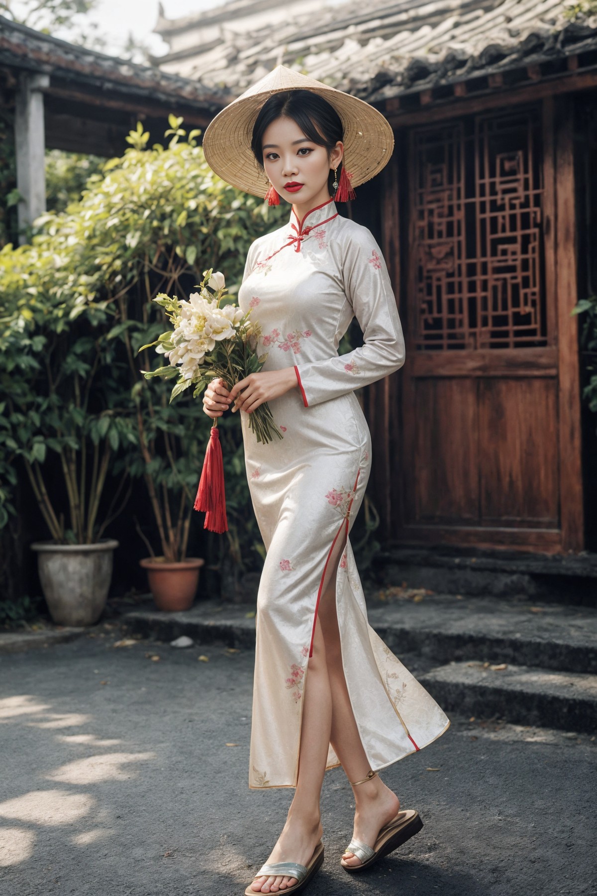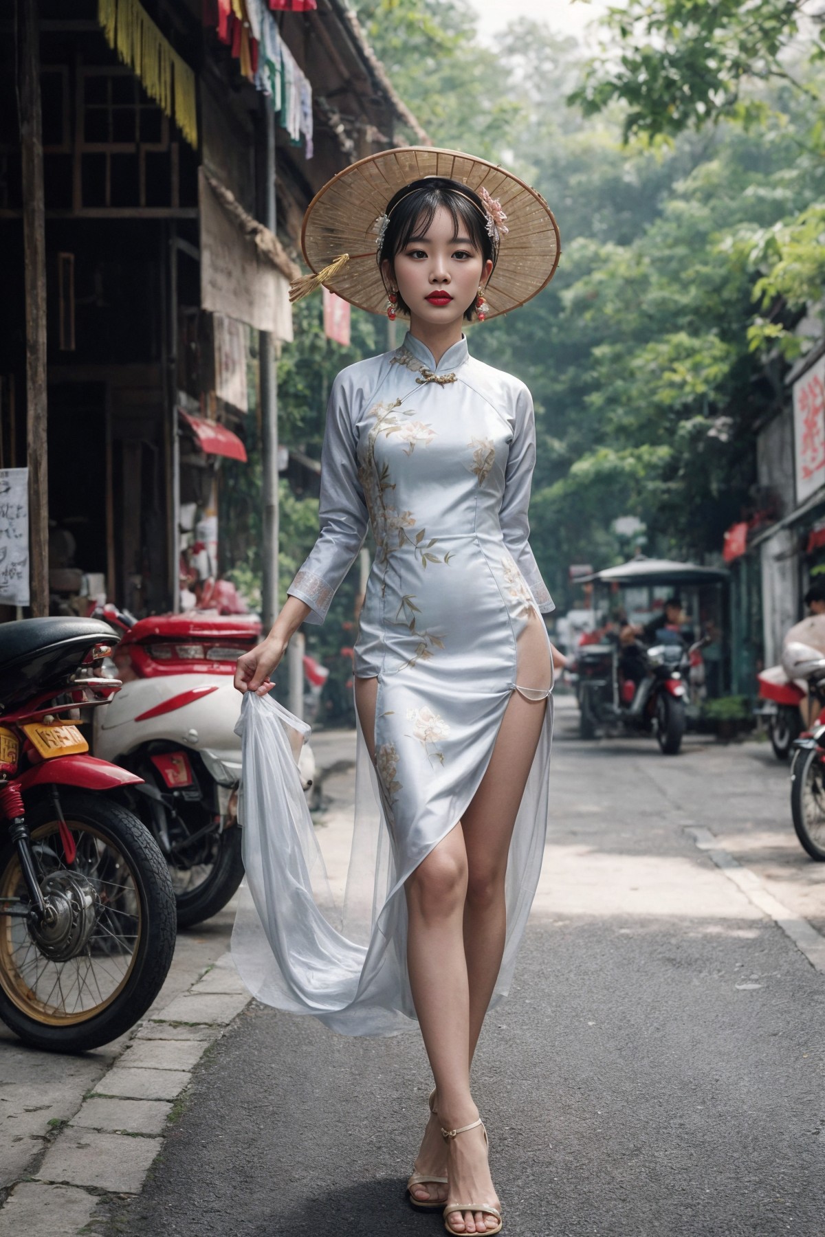nsfw, 1girl, solo, full body shot, Vietnamese woman wear vietnamese tradition dress, Cheongsam Ao Dai, short hair, vietnamese leaf hat, non la, daughter of rich family, walking with bamboo flute, aesthetic Vietnamese traditional costume, long dress, opened dress, exposed breasts, huge breasts, cleavage, nipple, chaste pose, modestly dressed, earrings, red lips, bare foot, Vietnamese sandals, Vietnamese market, street food, morning, sunshine, depth of field, bokeh, <lora:add_detail:1>, (masterpiece:1.3), extremely high details, (best quality:1.3), absurdres, (photorealistic), realistic, hyper-detailed, ray-tracing, high resolution, sharp focus, 8k, vibrant, intricate, sharpness and clarity, lifelike, hyper_realism