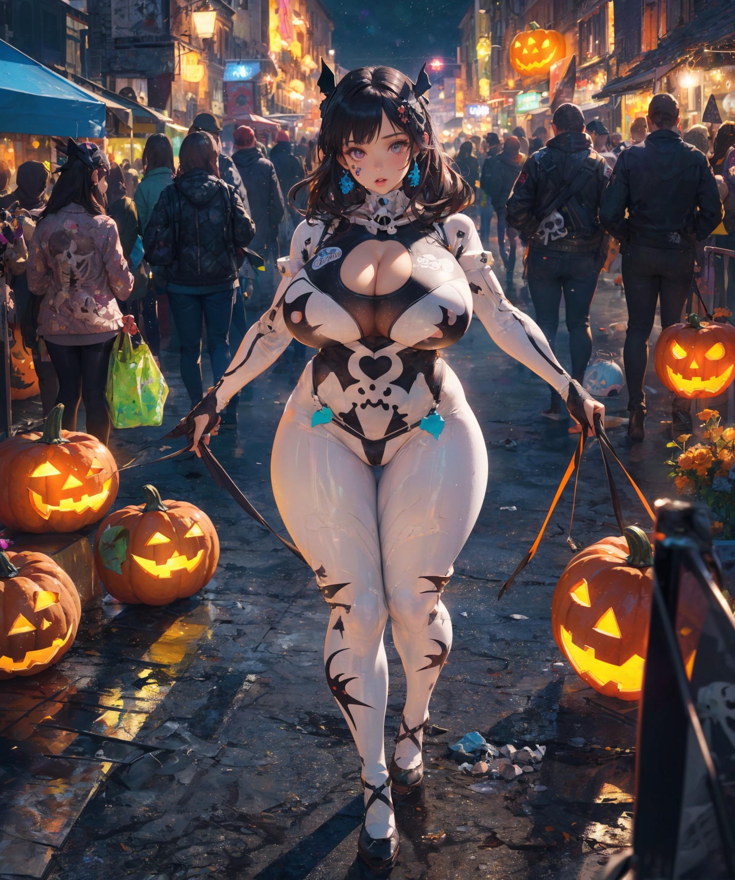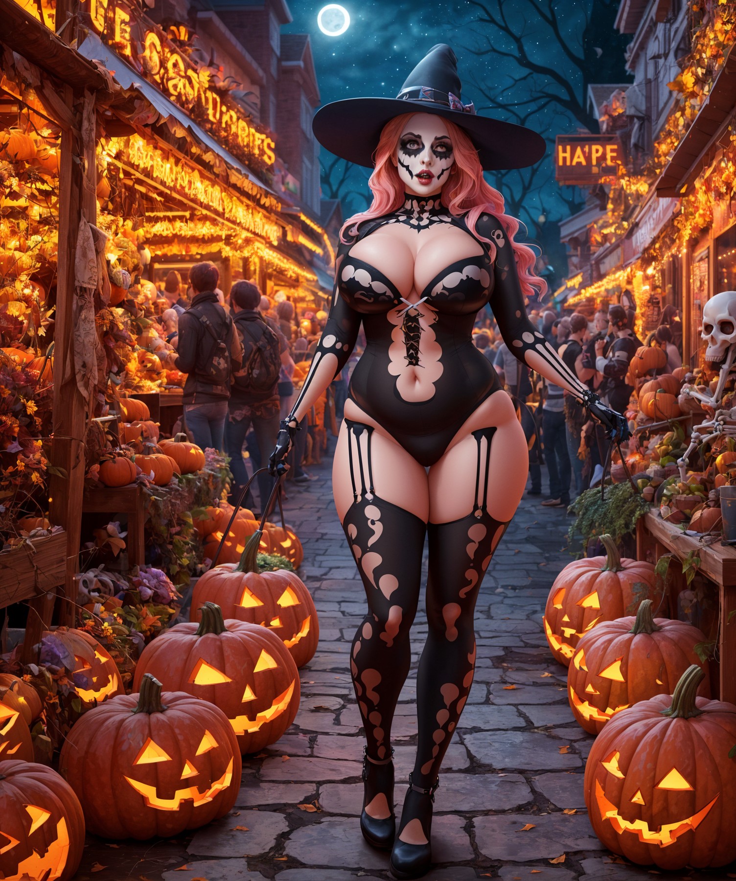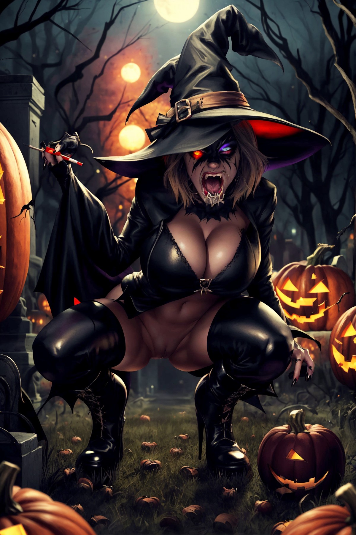 nsfw, 1girl, (full body:1.3), depic a naked girl in nude, (growling face:1.3), angry512, (growling pose:1.3), witch hat, red eyes, (vampire teeth:1.2), red lips, smoky makeup, long nails, naked, nude, bare breasts, gigantic breasts, cleavage, nipple, wide hip, thick thigh, huge puffy pussy bulge, big cameltoe, popped up belly, extraordinary pussy cleavage, pussy crack, female pubic hair, exposed pussy, pussy cleavage, boots, spooky, in halloween festival, festival decoration, graveyard, crowd, lights, bokeh, depth of field, pumpkins, night, night sky, full moon, bats, crows, halloween theme, (masterpiece:1.3), extremely high details, (best quality:1.3), absurdres, (photorealistic), realistic, hyper-detailed, ray-tracing, high resolution, sharp focus, 8k, vibrant, intricate, sharpness and clarity, lifelike, hyper_realism