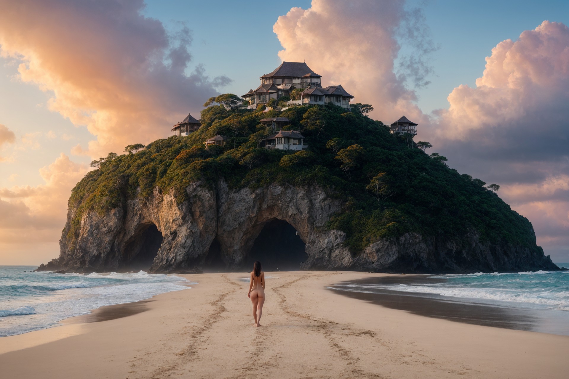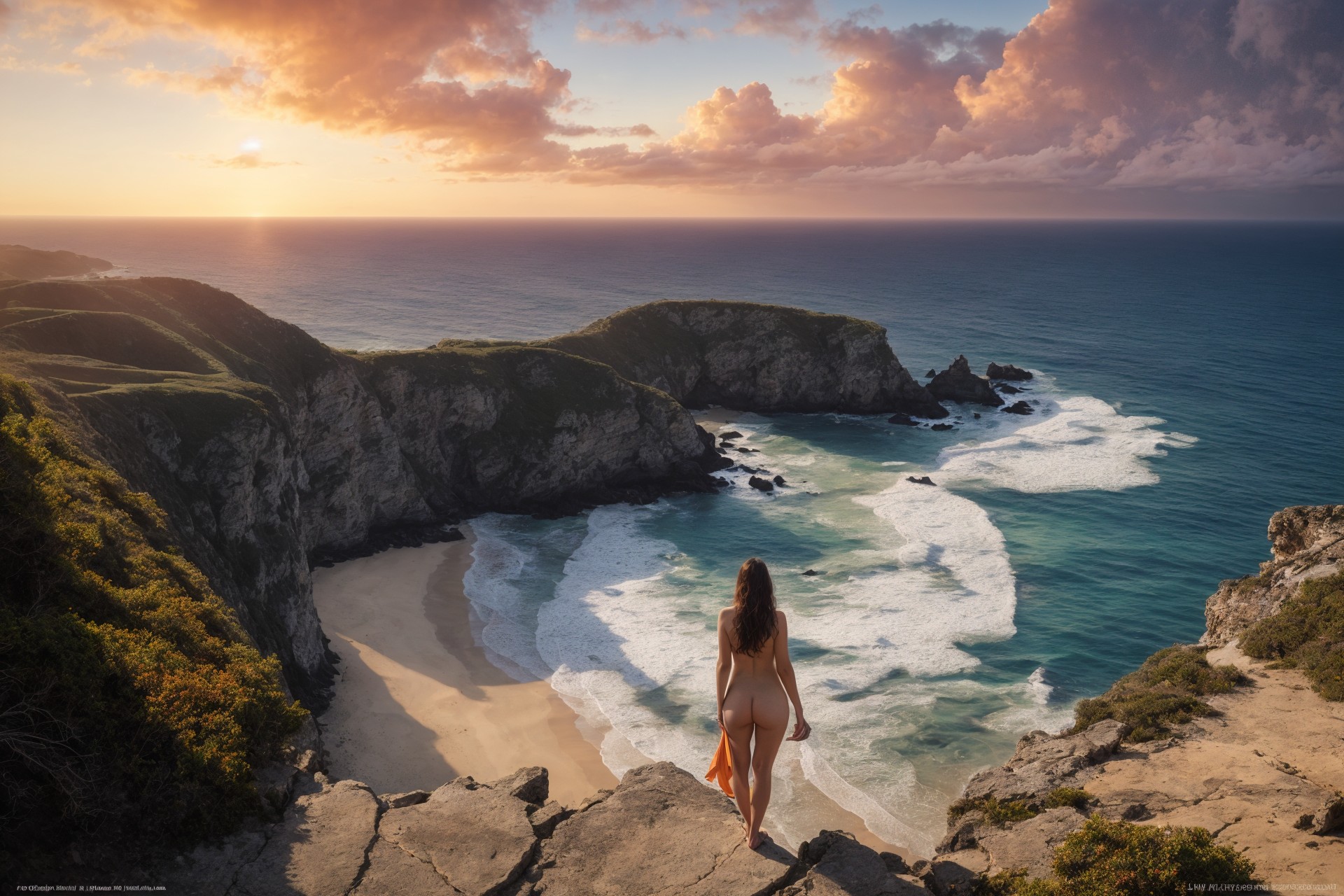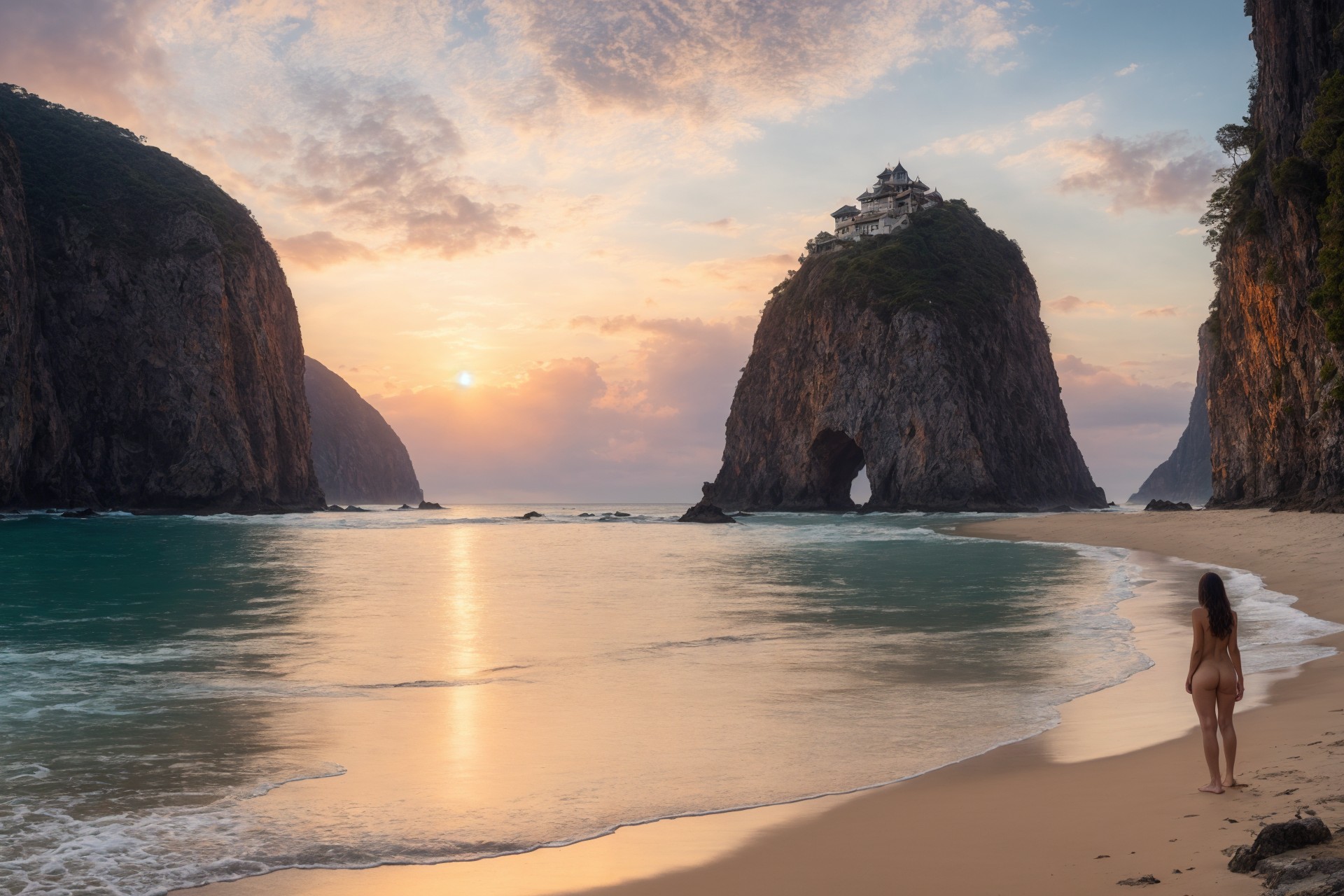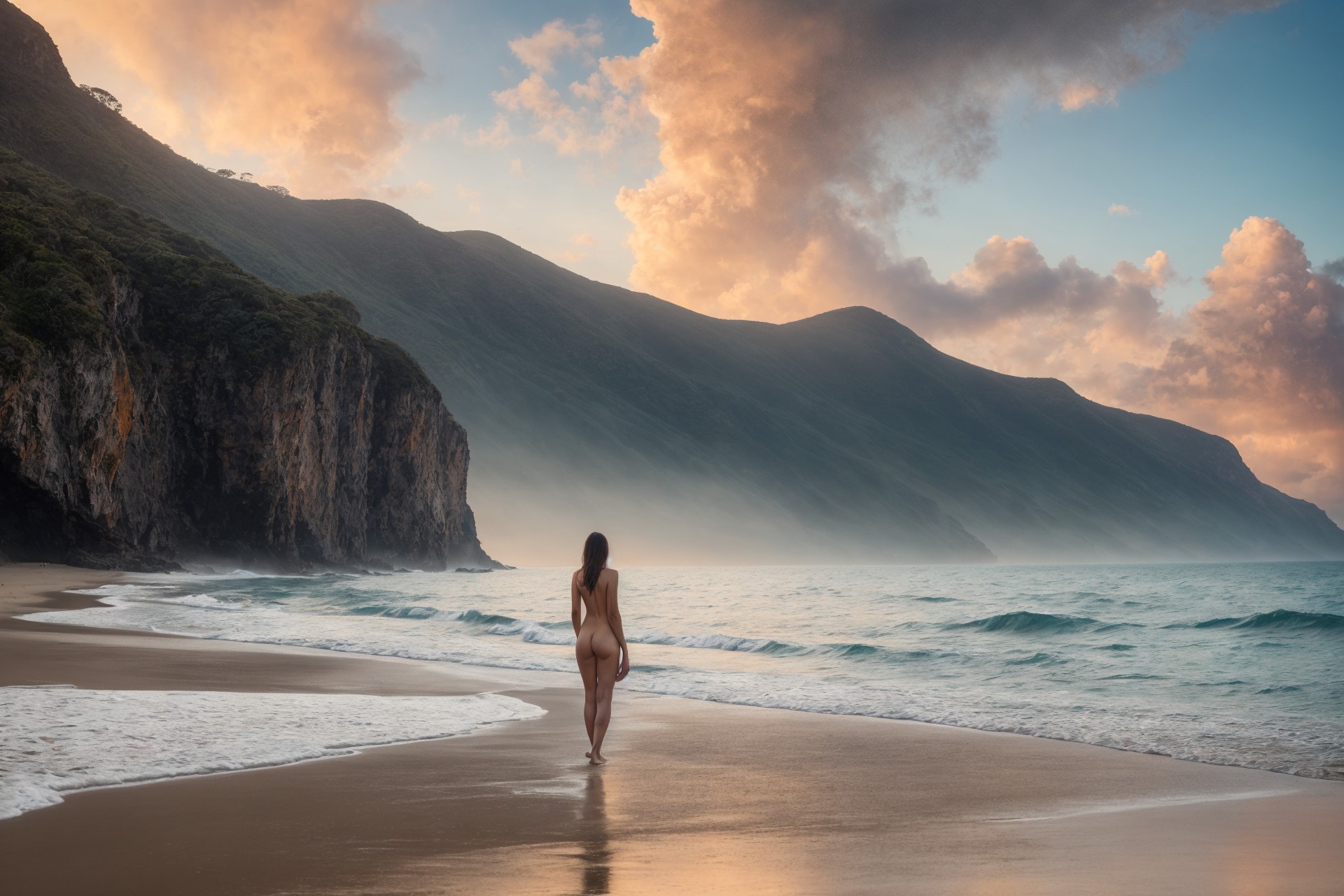 ethereal fantasy concept art of 1girl, (full body:1.3), naked asian woman standing at beach in background of sunset on horizon of ocean, nsfw, nude, huge asss, wide hip, huge breasts, nipple, pussy, pubic hair, fantastic sunset orange sky, clouds, ocean, sail boat on sea, (masterpiece:1.3), (best quality:1.3), extremely high details, absurdres, (photorealistic), realistic, hyper-detailed, ray-tracing, high resolution, sharp focus, 8k, vibrant, intricate, sharpness and clarity, lifelike, hyper_realism, magnificent, celestial, ethereal, painterly, epic, majestic, magical, fantasy art, cover art, dreamy