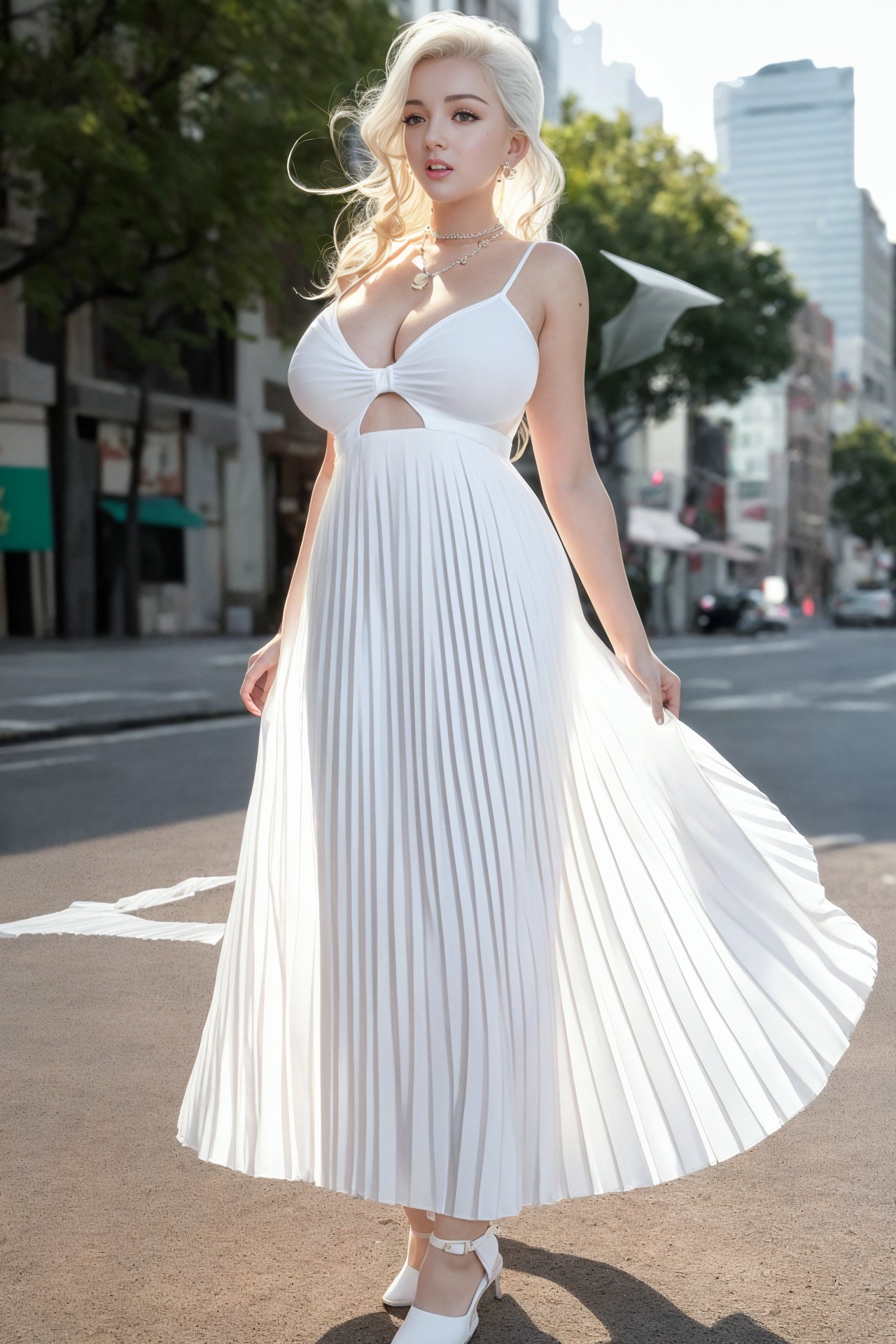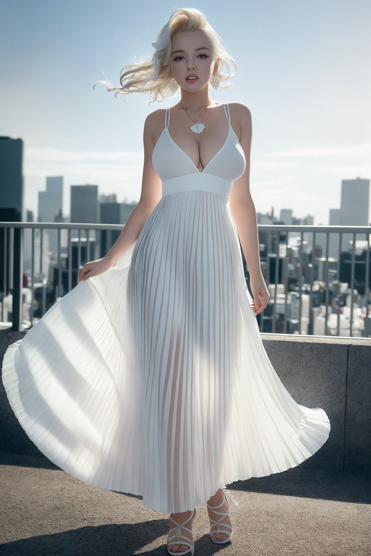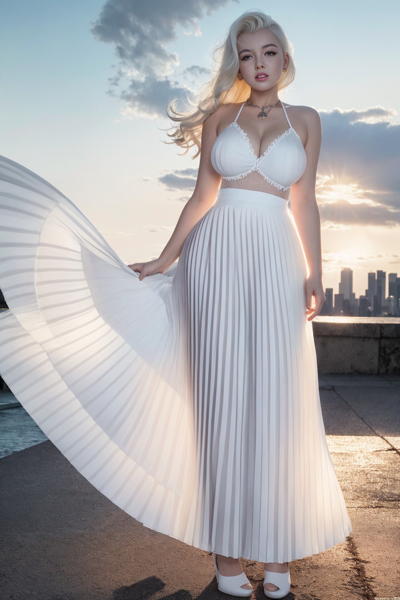 masterpiece, extremely high details, realistic, best quality, high resolution, hyper-detailed, ray-tracing, sharp focus, vibrant, intricate, sharpness and clarity, 1girl, solo, full body shot, depict a young girl imitating Marilyn Monroe's famous pose, (skirt blown up by wind:1.5), standing on air vent, street in New York city, at sunset, sunlight, baby face, pretty face, earring, necklace, (wear white pleated maxi dress:1.5), showing white panty, blonde hair, medium breasts, garter belt, fishnet stocking, high heels, looking at viewer, blurry background, lens flare