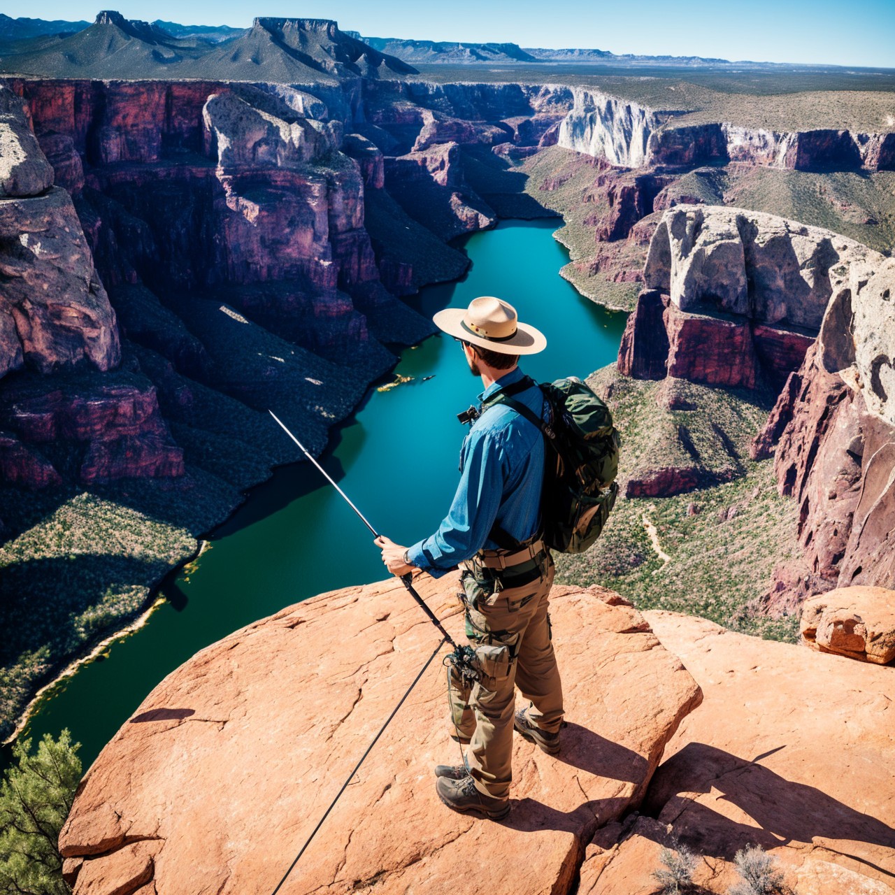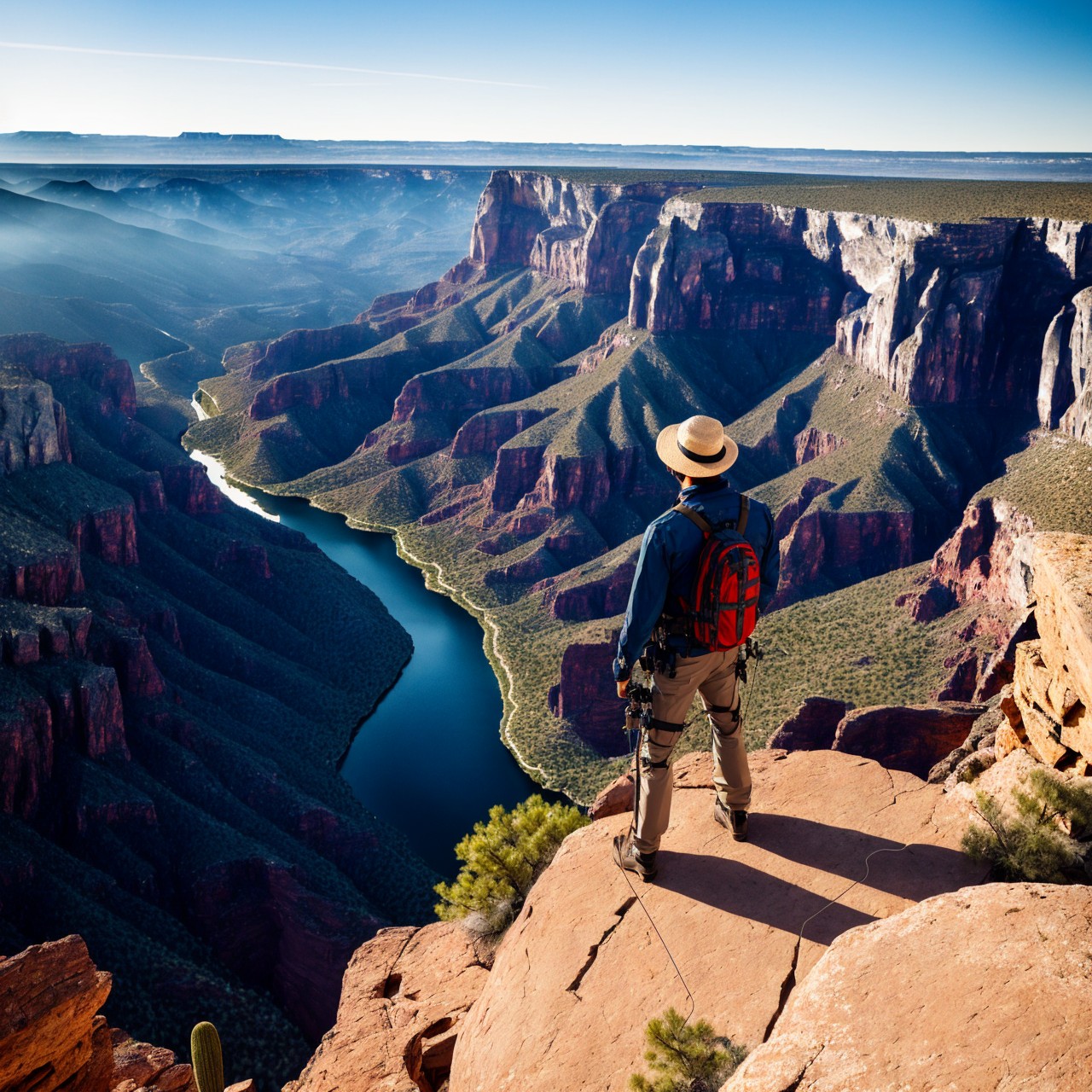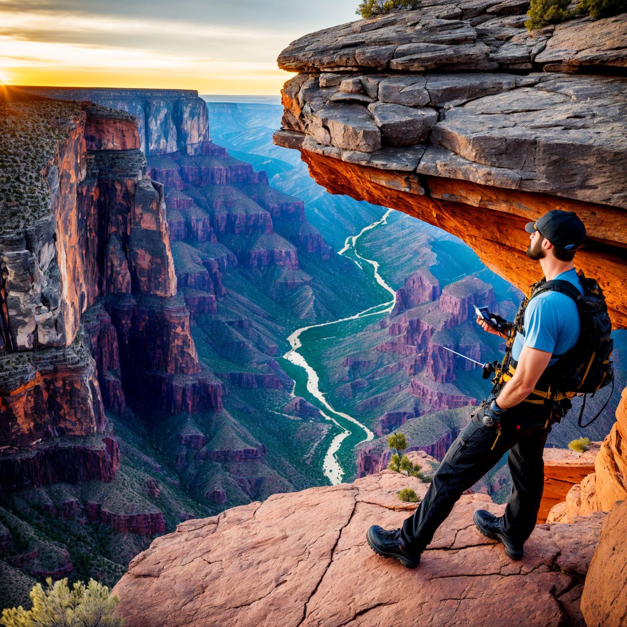 masterpiece, extremely high details, realistic, best quality, high resolution, hyper-detailed, ray-tracing, sharp focus, vibrant, intricate, sharpness and clarity, depicting a man on edge of high rock in Arizona