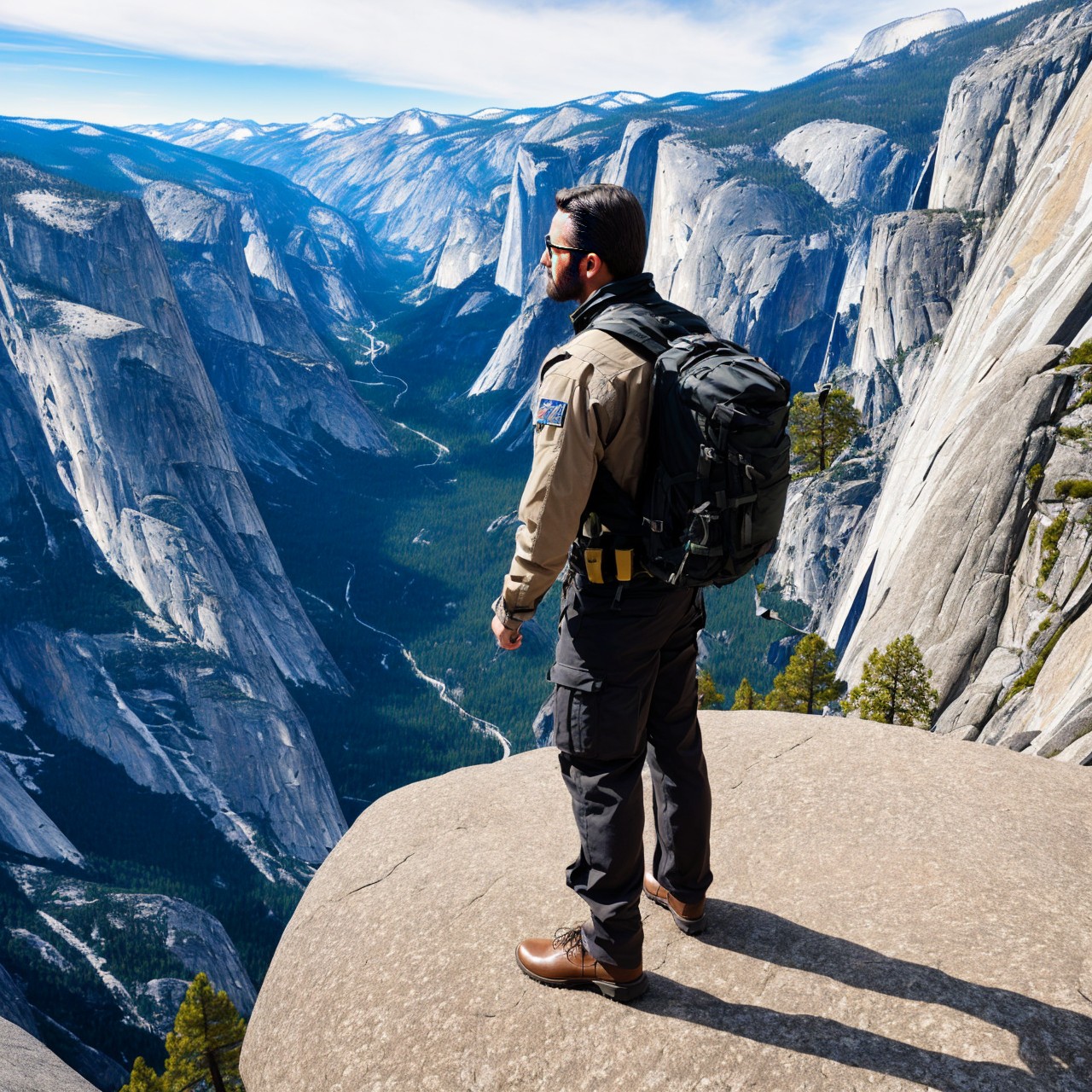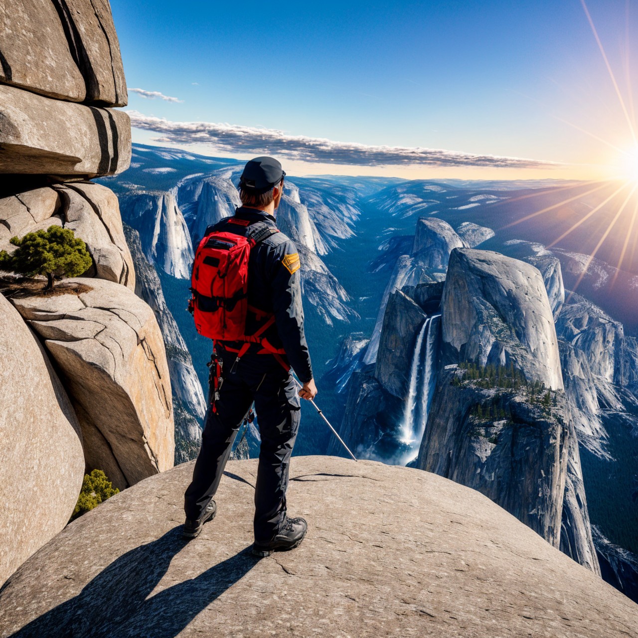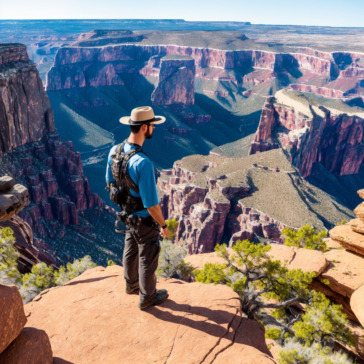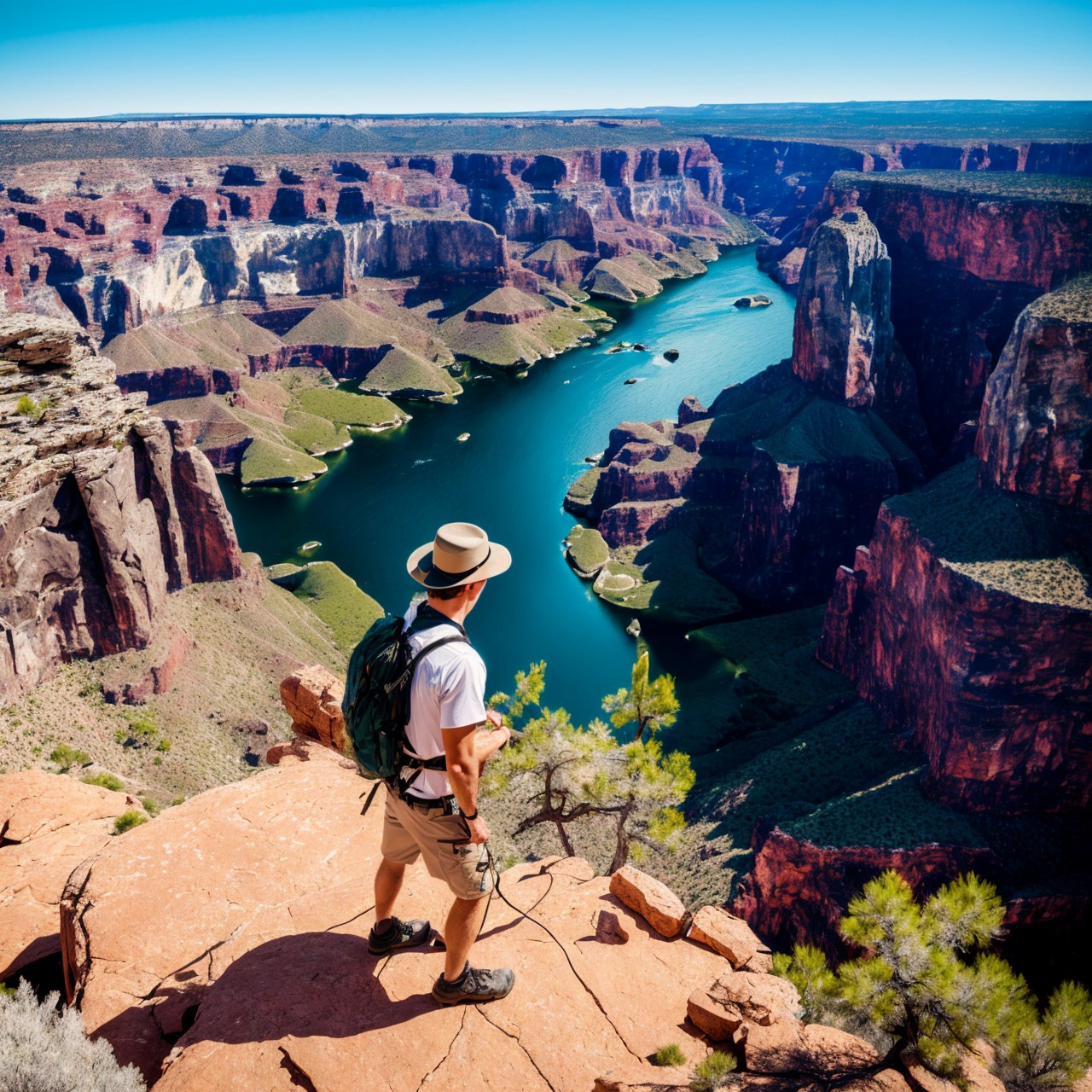 masterpiece, extremely high details, realistic, best quality, high resolution, hyper-detailed, ray-tracing, sharp focus, vibrant, intricate, sharpness and clarity, depicting a man on edge of high rock in Arizona