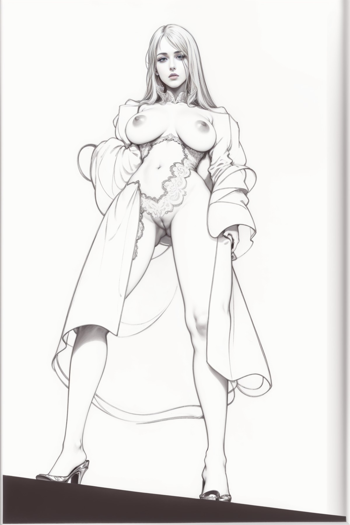 1girl, full body shot, standing, nsfw, view from below, long hair, long coat, bare breasts, large breasts, navel, woman pubic hair, pussy, thigh, long legs, high heels, masterpiece, extremely high details, realistic, best quality, absurdres, high resolution, hyper-detailed, ray-tracing, sharp focus, vibrant, intricate, sharpness and clarity