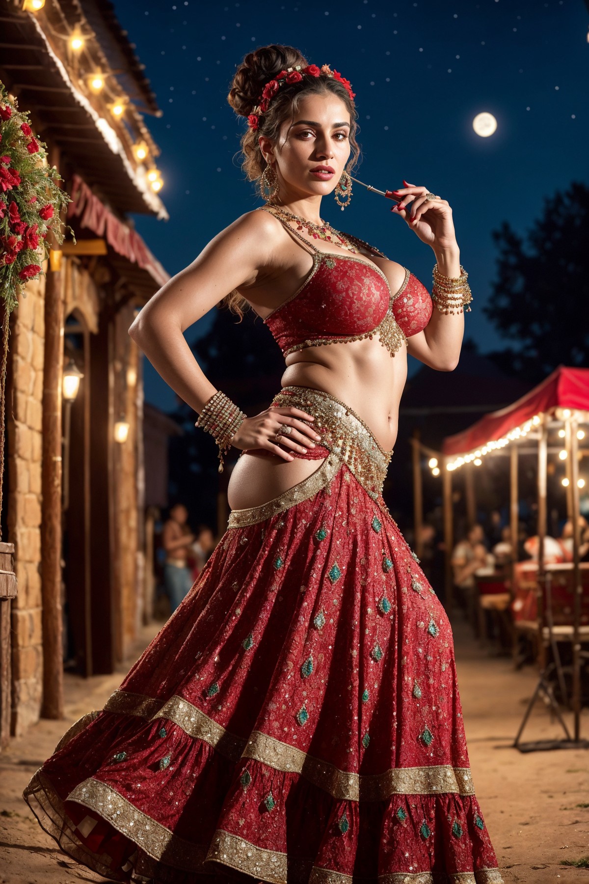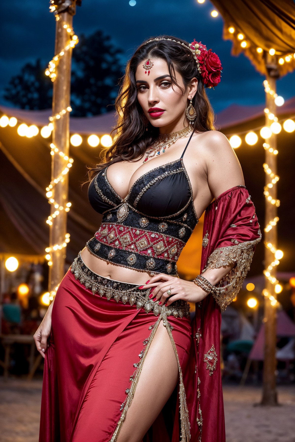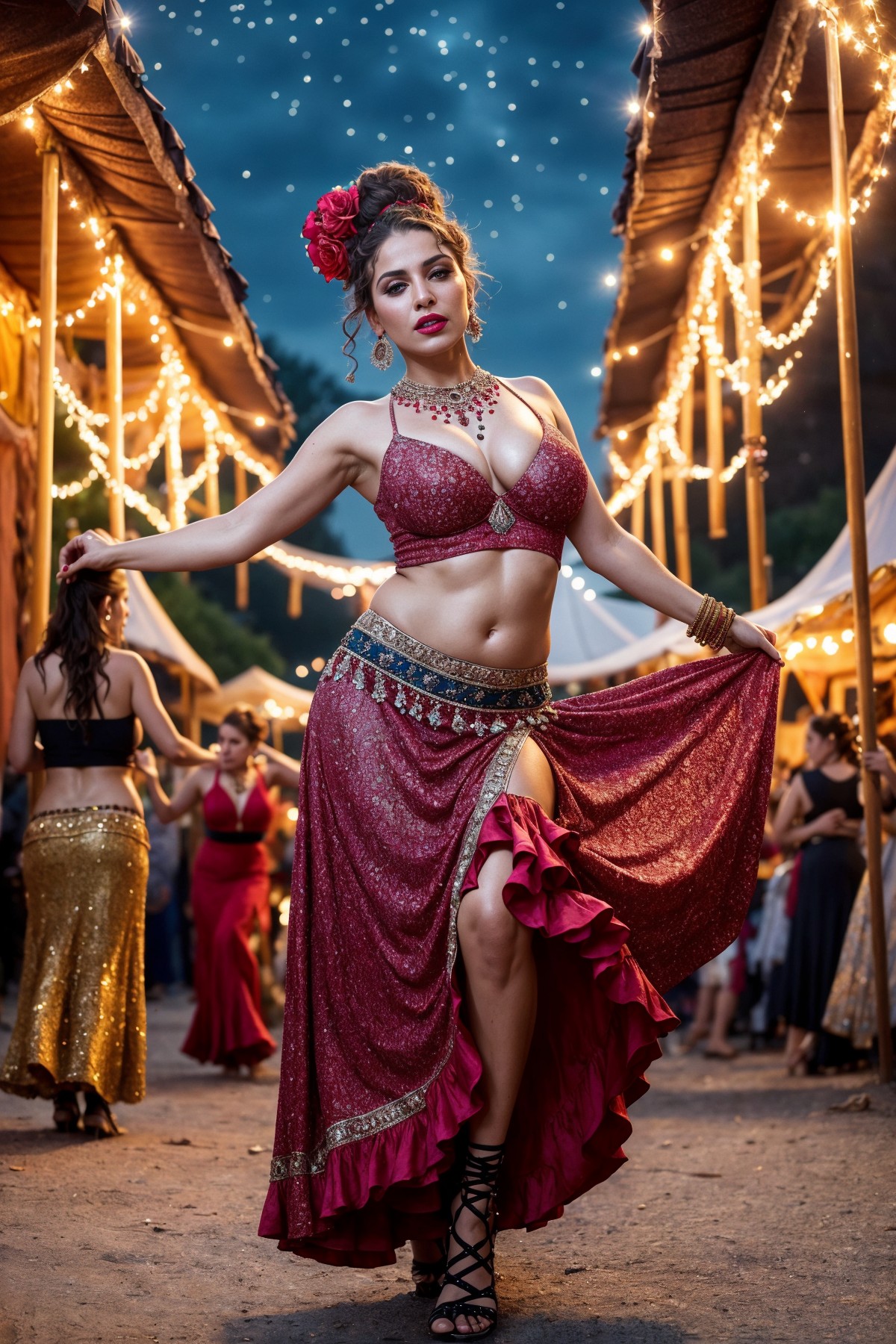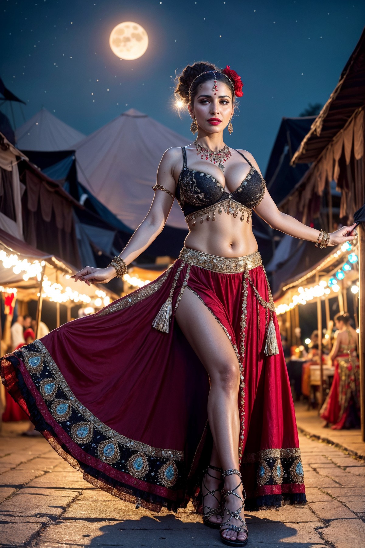 1girl, (full body:1.3), 50 years old gypsy woman, a gypsy woman dancer wearing a long flamenco dress and dancing on a street, Spanish Dance Costume, black golden red color Flamenco Dance Skirt, long skirt, huge boobs, tight shirt, huge breasts, cleavage, necklace, earring, high bun hair, booty, wide hip, toenail polish, nail polish, lipstick, makeup, a red flower on head, Belly Dance Skirt, Spanish Clothing, Ballroom Dancing, gypsy camp, tent houses, gypsy village, crowd, night, torch, campfire, lights, night sky, full moon, bokeh, depth of field, <lora:detail_slider_v4:2>, (masterpiece:1.3), extremely high details, (best quality:1.3), absurdres, (photorealistic), realistic, hyper-detailed, ray-tracing, high resolution, sharp focus, 8k, vibrant, intricate, sharpness and clarity, lifelike, hyper_realism