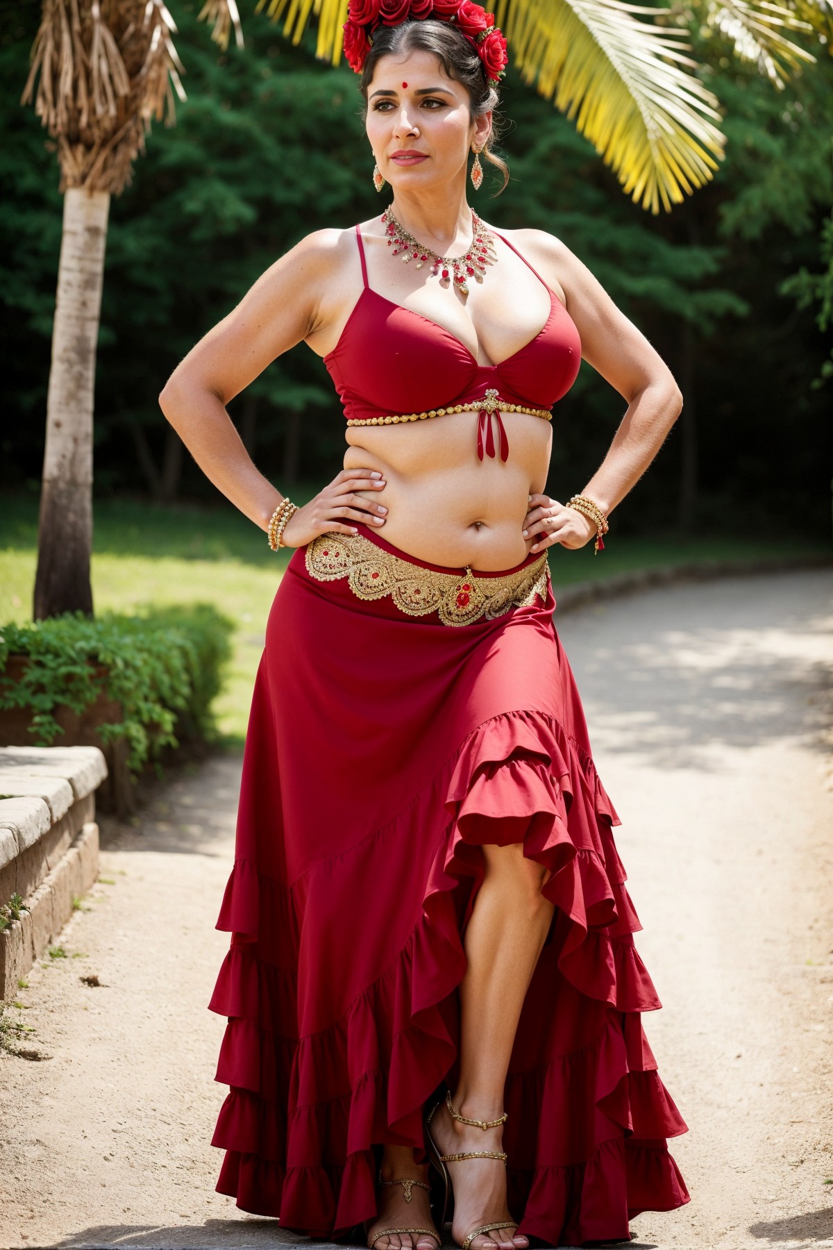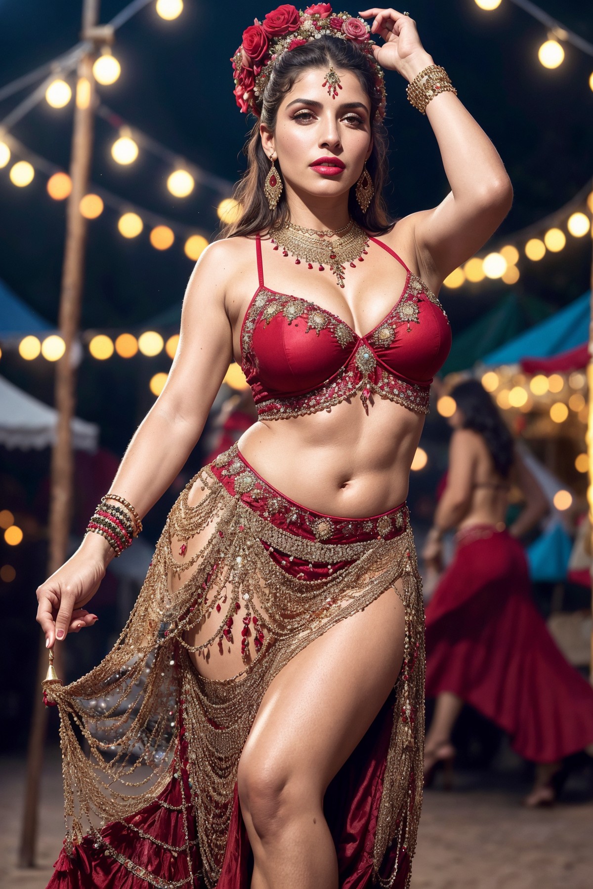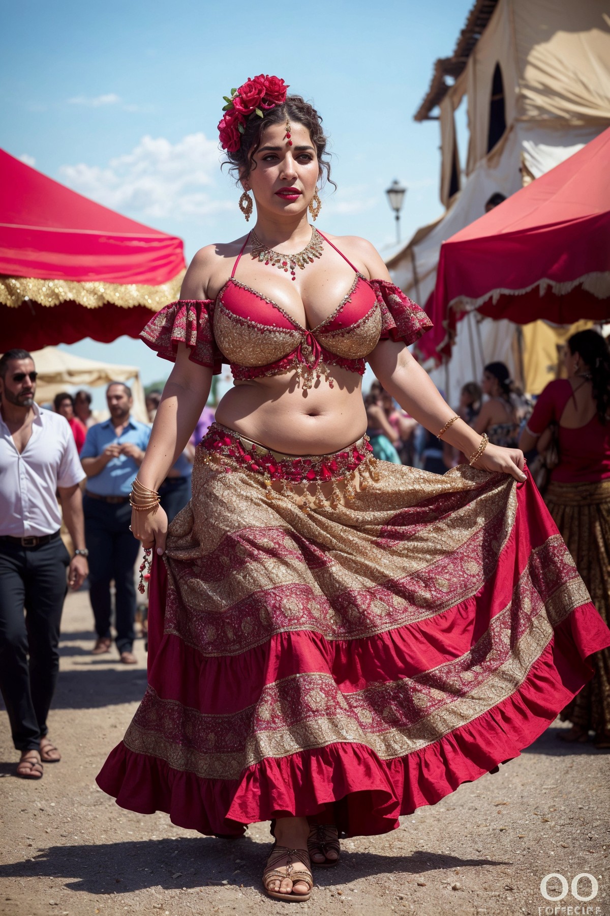 1girl, (full body:1.3), 50 years old gypsy woman, a gypsy woman dancer wearing a long flamenco dress and dancing on a street, Spanish Dance Costume, black golden red color Flamenco Dance Skirt, long skirt, huge boobs, tight shirt, huge breasts, cleavage, necklace, earring, high bun hair, booty, wide hip, toenail polish, nail polish, lipstick, makeup, a red flower on head, Belly Dance Skirt, Spanish Clothing, Ballroom Dancing, gypsy camp, tent houses, gypsy village, crowd, night, torch, campfire, lights, night sky, full moon, bokeh, depth of field, <lora:detail_slider_v4:2>, (masterpiece:1.3), extremely high details, (best quality:1.3), absurdres, (photorealistic), realistic, hyper-detailed, ray-tracing, high resolution, sharp focus, 8k, vibrant, intricate, sharpness and clarity, lifelike, hyper_realism