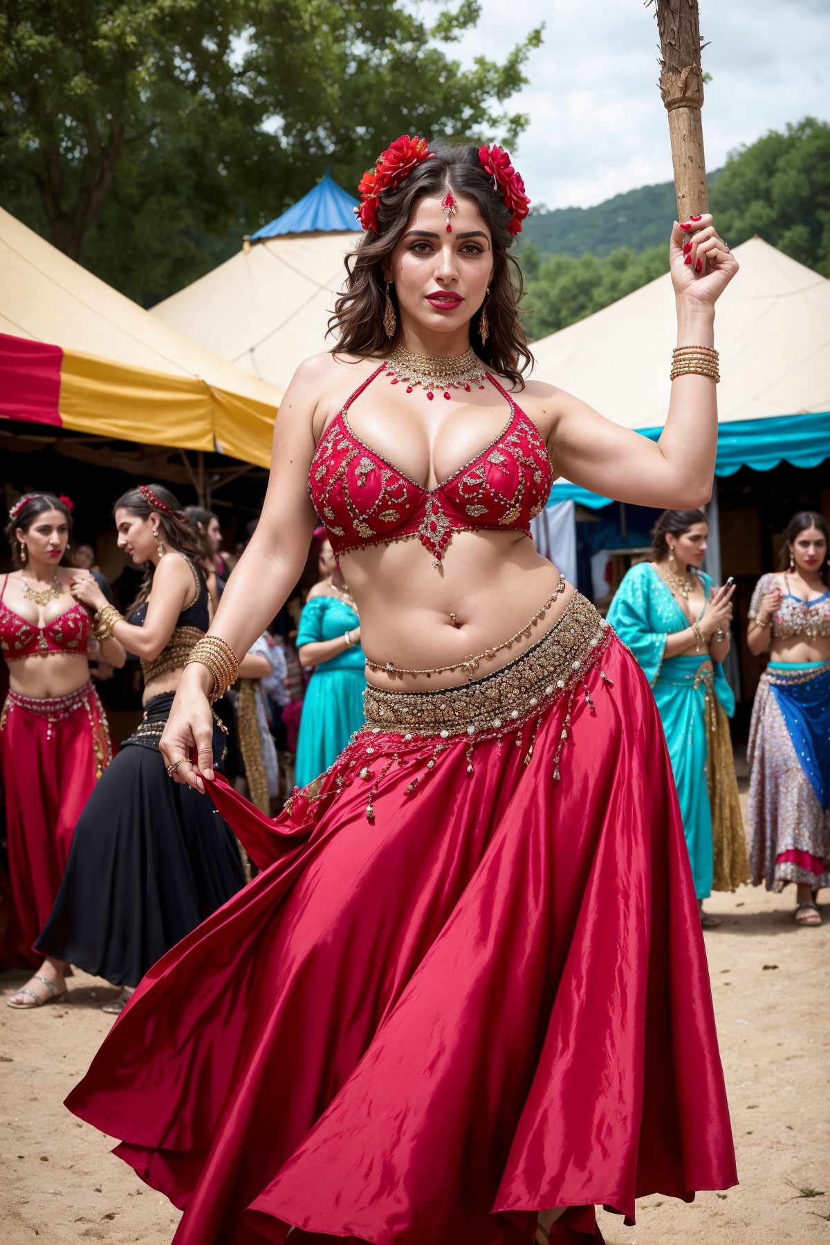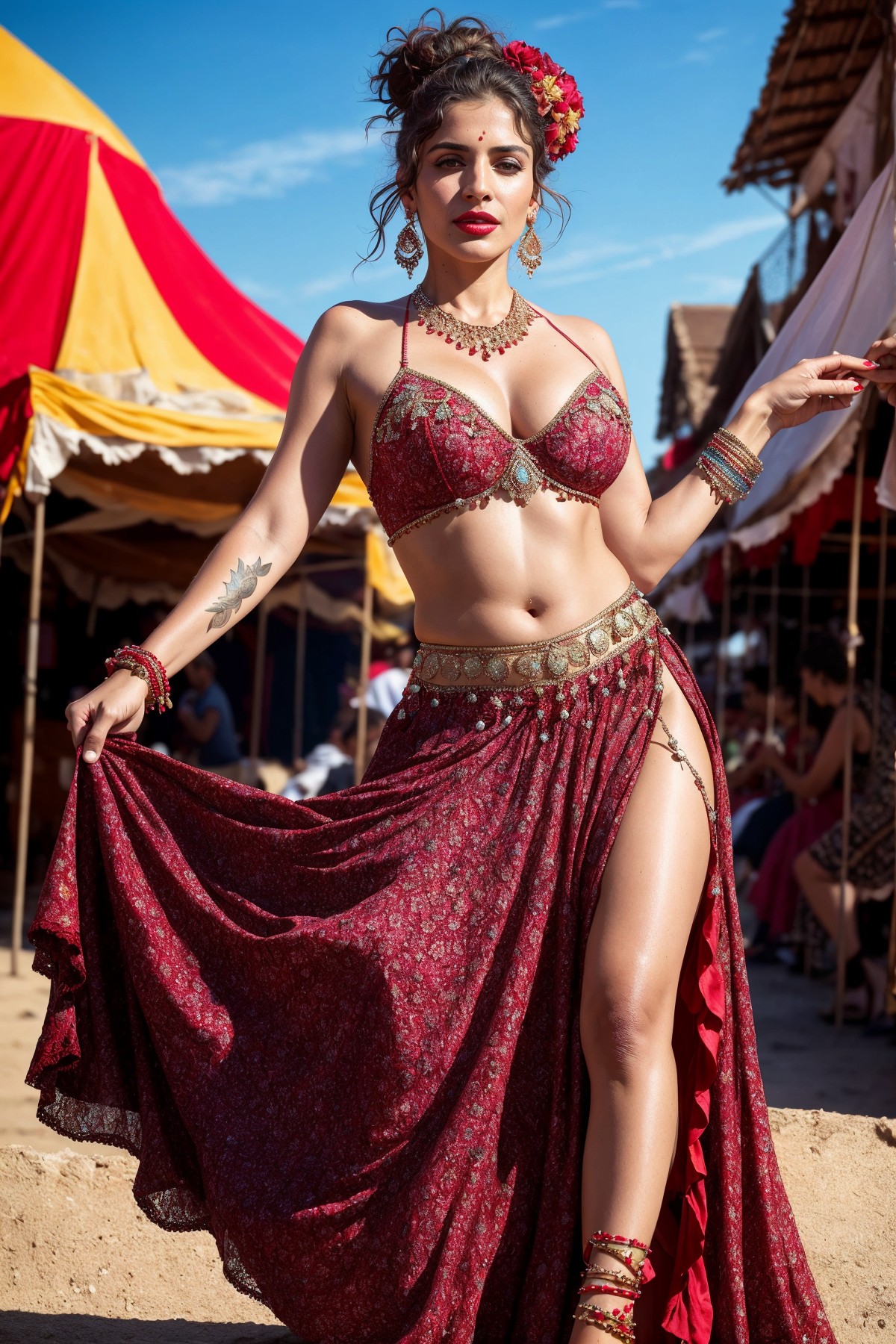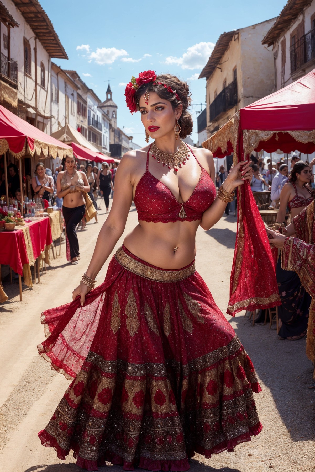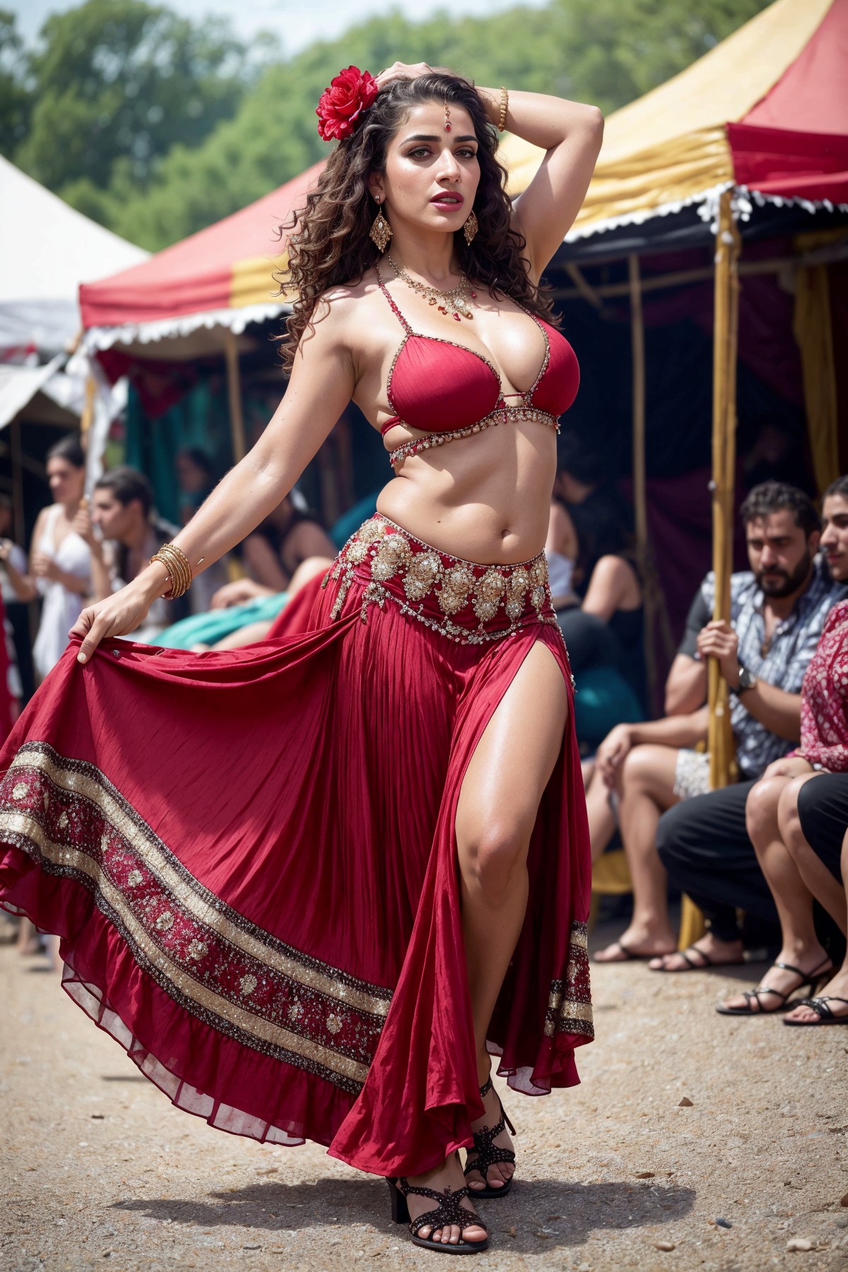 1girl, (full body:1.3), 50 years old gypsy woman, a gypsy woman dancer wearing a long flamenco dress and dancing on a street, Spanish Dance Costume, black golden red color Flamenco Dance Skirt, long skirt, huge boobs, tight shirt, huge breasts, cleavage, necklace, earring, high bun hair, booty, wide hip, toenail polish, nail polish, lipstick, makeup, a red flower on head, Belly Dance Skirt, Spanish Clothing, Ballroom Dancing, gypsy camp, tent houses, gypsy village, crowd, night, torch, campfire, lights, night sky, full moon, bokeh, depth of field, <lora:detail_slider_v4:2>, (masterpiece:1.3), extremely high details, (best quality:1.3), absurdres, (photorealistic), realistic, hyper-detailed, ray-tracing, high resolution, sharp focus, 8k, vibrant, intricate, sharpness and clarity, lifelike, hyper_realism