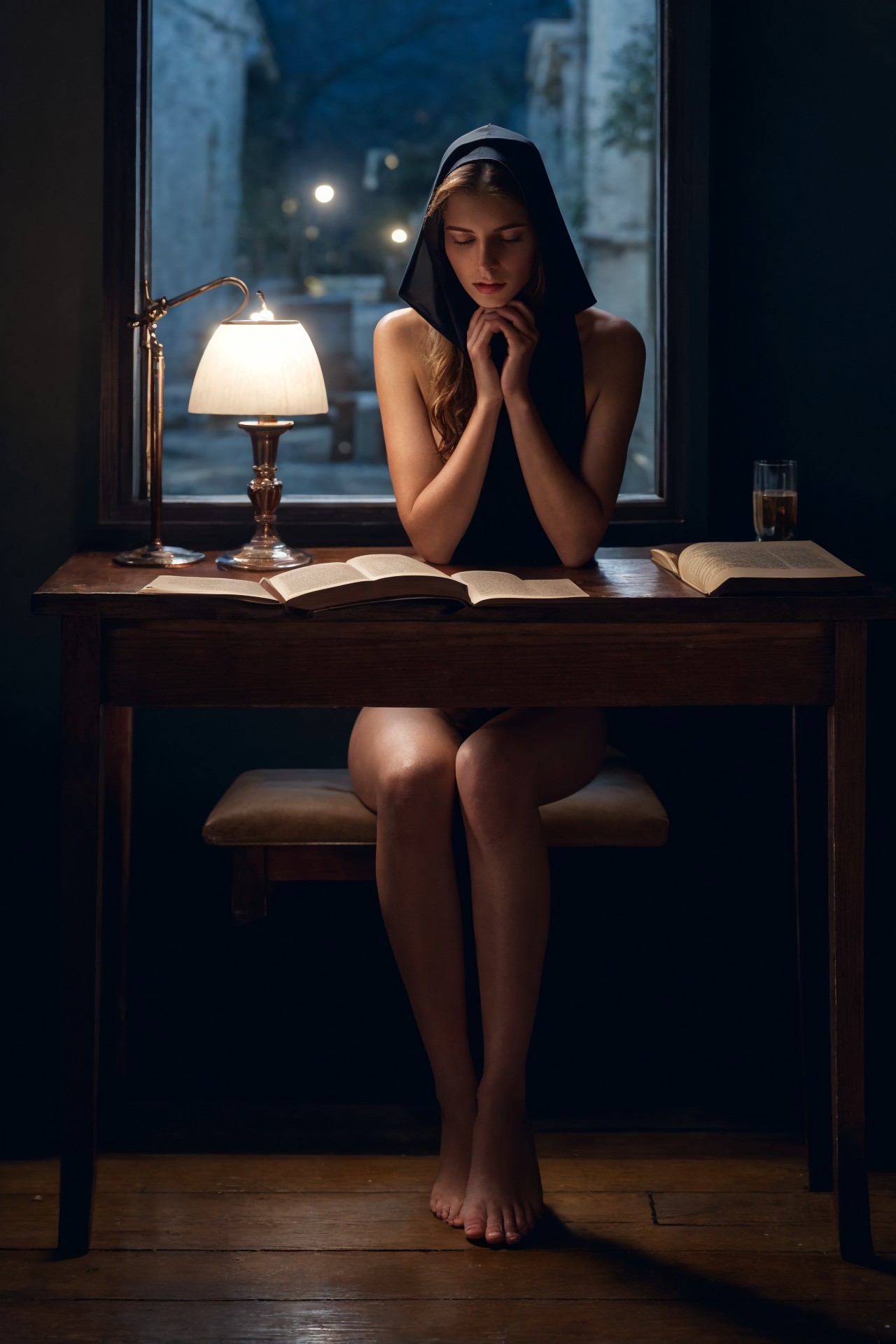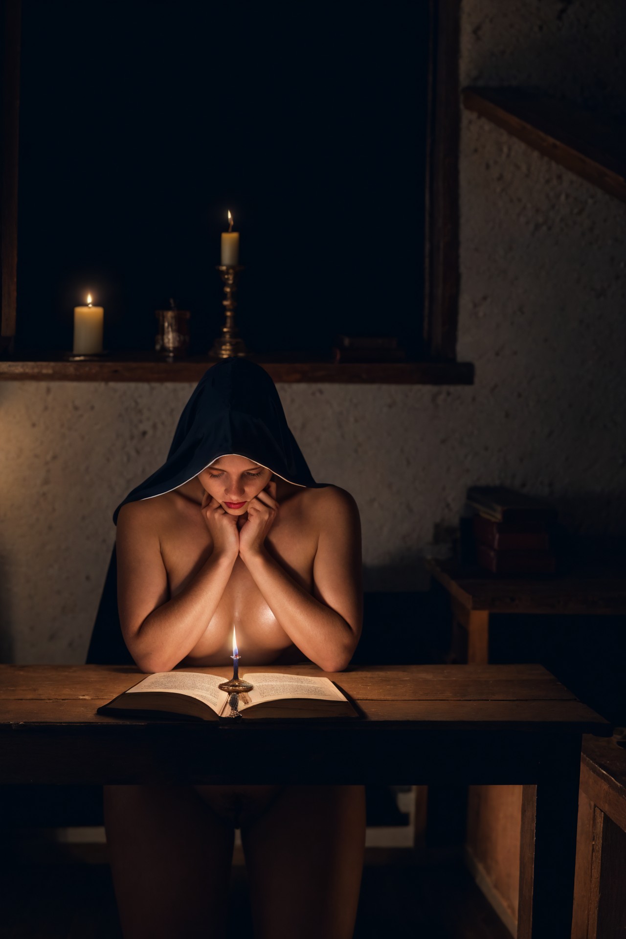 1girl, (full body:1.3), art photography, depict a naked girl in veil on head praying at night, small antique wooden desk, Bible on desk, dark night, 1candle, candle light reflection on body, dark atmosphere, ambient light, prayer, praying, naked, big breasts, big puffy nipple, (pubic hair), sitting down, garret, attic, <lora:LowRA_2:0.7>, view from behind, asses, (masterpiece:1.3), (best quality:1.3), extremely high details, absurdres, (photorealistic), realistic, hyper-detailed, ray-tracing, high resolution, sharp focus, 8k, vibrant, intricate, sharpness and clarity, lifelike, hyper_realism