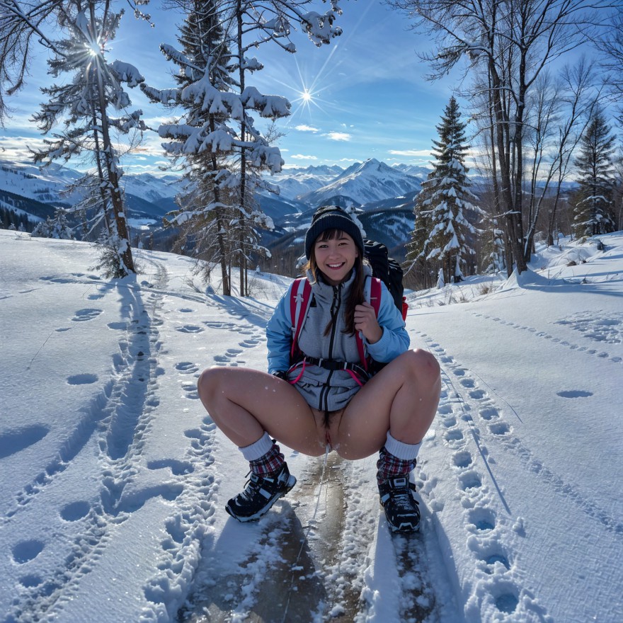 1girl, (full body:1.3), cute asian girl pissing on snow, sitting on snow, peeing, snow mountain peak, winter, wear padding jumper, (wear backpack:1.3), socks, mountain hike boots, nsfw, huge boobs, smile512, squatting, pulling pants down, (spread legs:1.3), exposed pussy, hairy pubic hair, depth of field, mountain, snowy trees, sky, sunlight, day, cloud, <lora:PeeingWoman1.2:0.6>, <lora:zoom_slider_v1:-4>, (masterpiece:1.3), (best quality:1.3), extremely high details, absurdres, (photorealistic), realistic, hyper-detailed, ray-tracing, high resolution, sharp focus, 8k, vibrant, intricate, sharpness and clarity, lifelike, hyper_realism