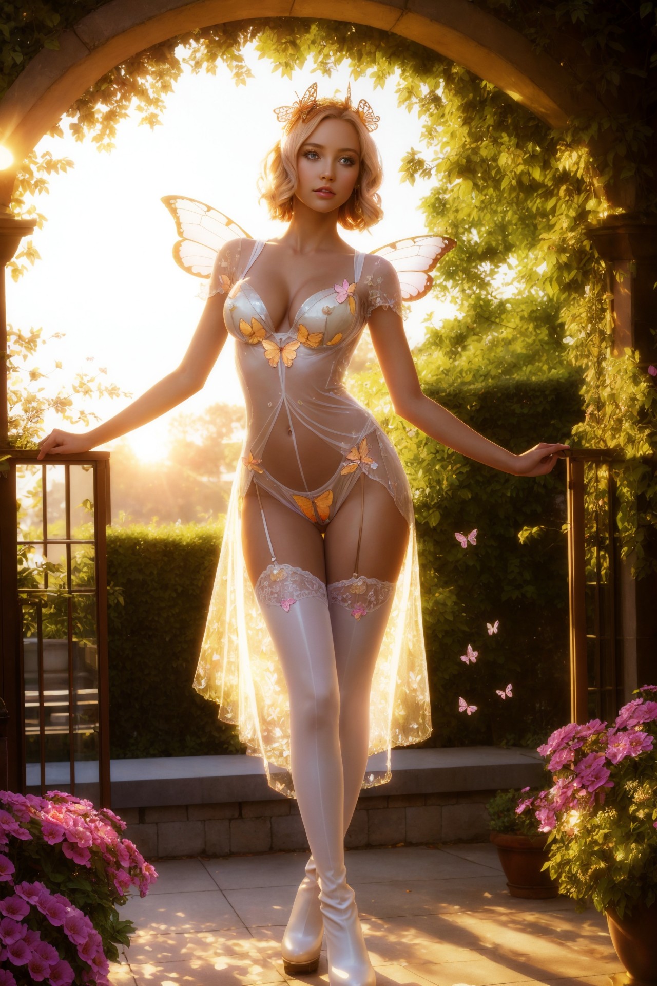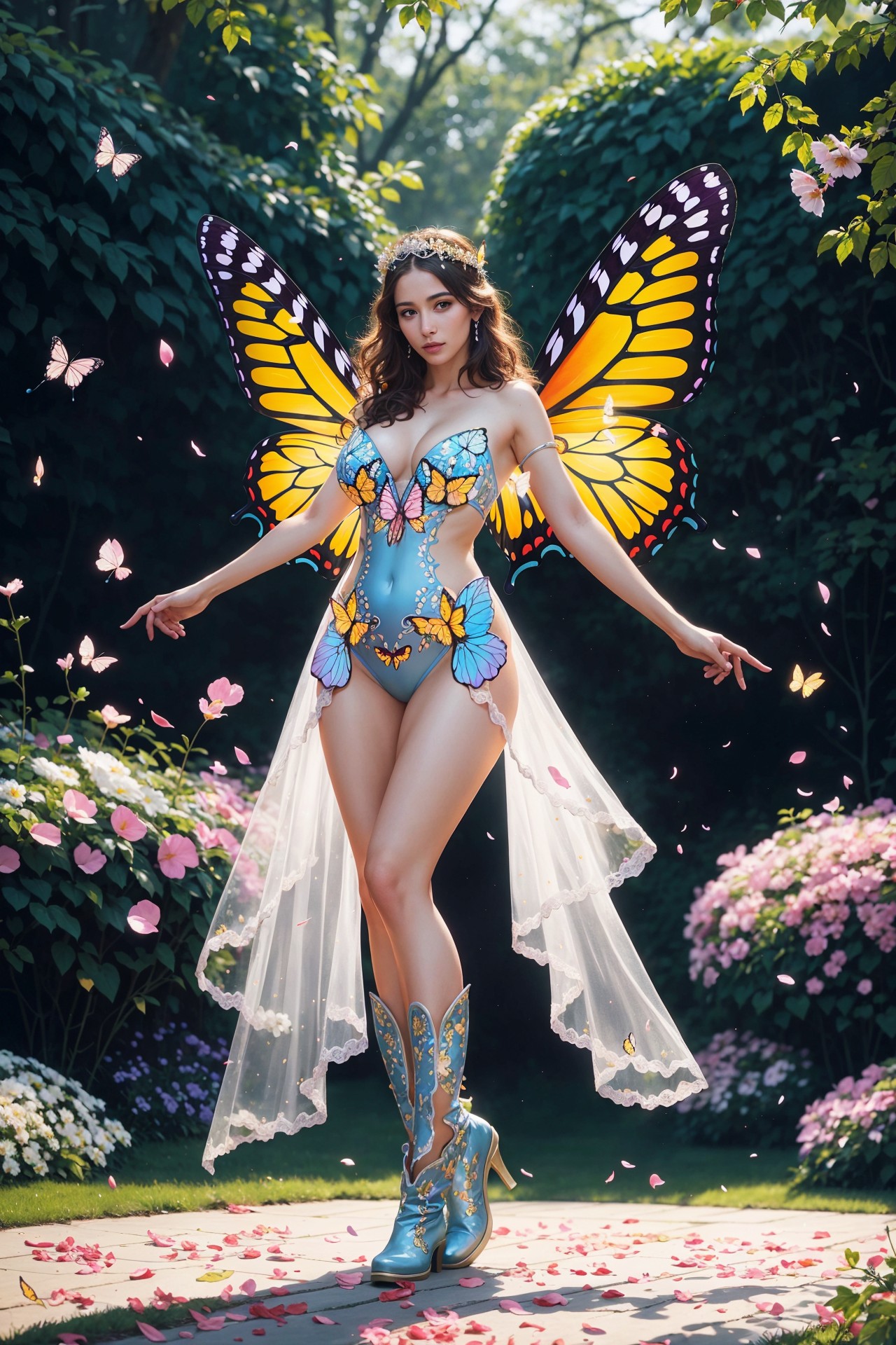 1girl, (full body:1.3), butterfly fairy illustration photography, (butterfly girl in pose on surreal artificial huge flower petals:1.3), captivating and whimsical portrayal of girl dressed in a delicate see-through costume resembling butterfly, intricate lace patterns and shimmering sequins, big butterfly wing costume, big breasts, slim waist, wide hip, long legs, laced boots, ethereal golden glow, in a fairy-tale garden, vibrant flowers, fluttering butterflies, soft light, sun bathes in a warm magical glow, creating a dreamlike atmosphere, depth of field, (masterpiece:1.3), (best quality:1.3), extremely high details, absurdres, (photorealistic), realistic, hyper-detailed, ray-tracing, high resolution, sharp focus, 8k, vibrant, intricate, sharpness and clarity, lifelike, hyper_realism