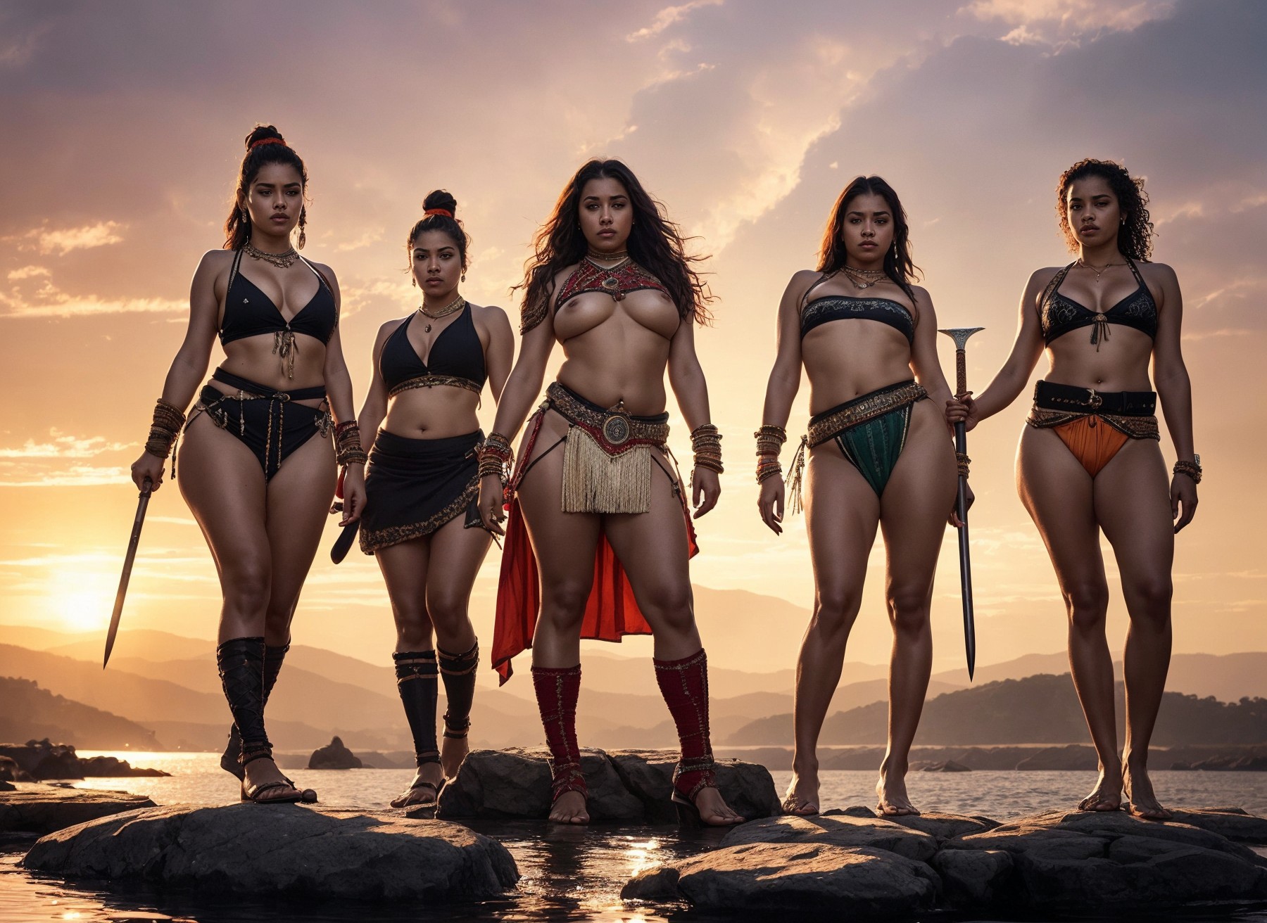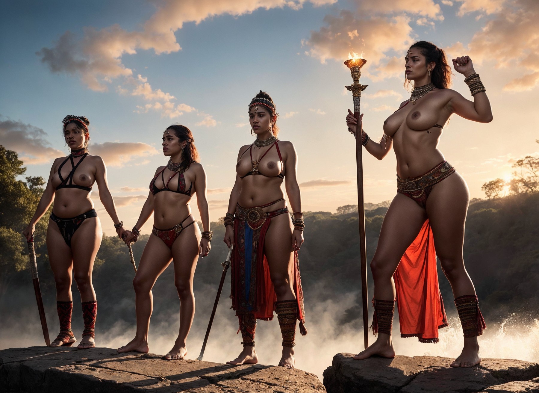 1girl, 2girls, 3girls, multiple girls, full body shot, Depict ancient amazones patriarch with women performing tribal ritual ceremony on stone altar, torches, strong warriors, huge breasts, wide hips, thick thighs, animal skin clothes, clothed or naked, amazon tribal, naked dancers dancing, huge penis stone statues, castle, cliff, water falls, fantasy world, skimpy nature tribe clothes, accessories, dark skin, head tie, female pubic hair, body harness, waist belt, sword, spear and shield, musical instruments , day, sky, cloud, (masterpiece:1.3), extremely high details, (best quality:1.3), absurdres, (photorealistic), realistic, hyper-detailed, ray-tracing, high resolution, sharp focus, 8k, vibrant, intricate, sharpness and clarity, lifelike, hyper_realism