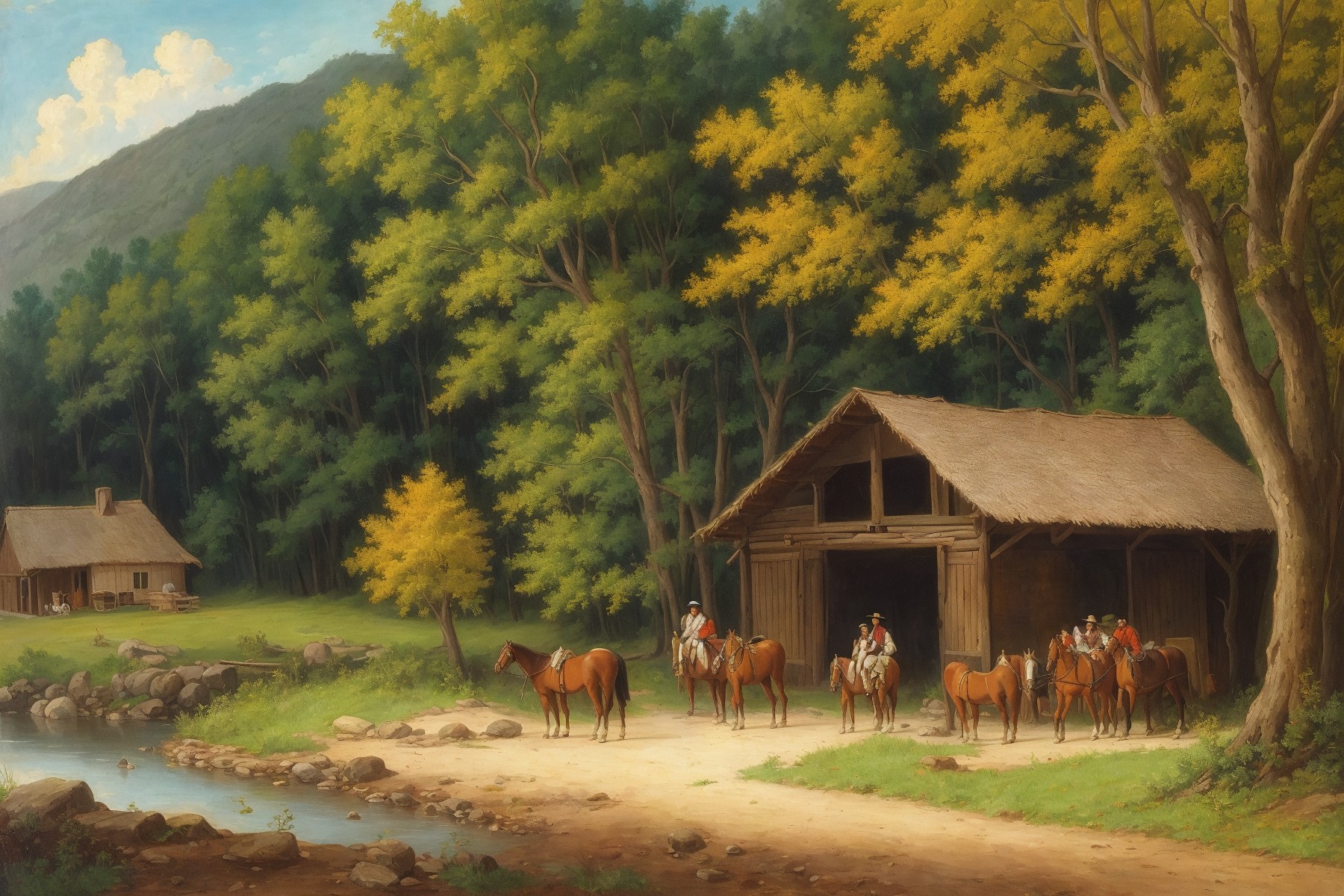 art style of asher brown durand, depict american indian's life, river, field, tree, horse, indian house, indian residential villlage, 1800's native indians
