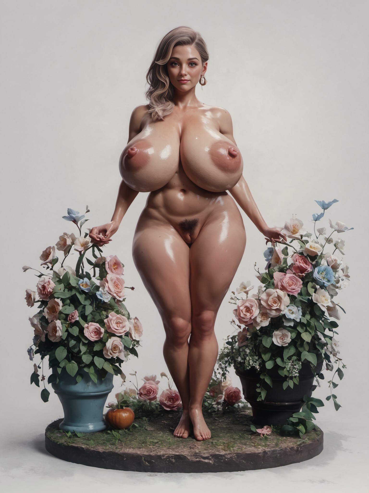score_9, score_8_up, score_7_up, score_6_up, score_5_up, score_4_up, nsfw, full body, model shot of a naked Asian girl having huge breasts with big puffy nipple, cute face, puffy big areola, pussy, pubic hair, shiny skin, looking at viewer, background of flower garden, <lora:Concept Art Ultimatum Style LoRA_Pony XL v6:0.8>