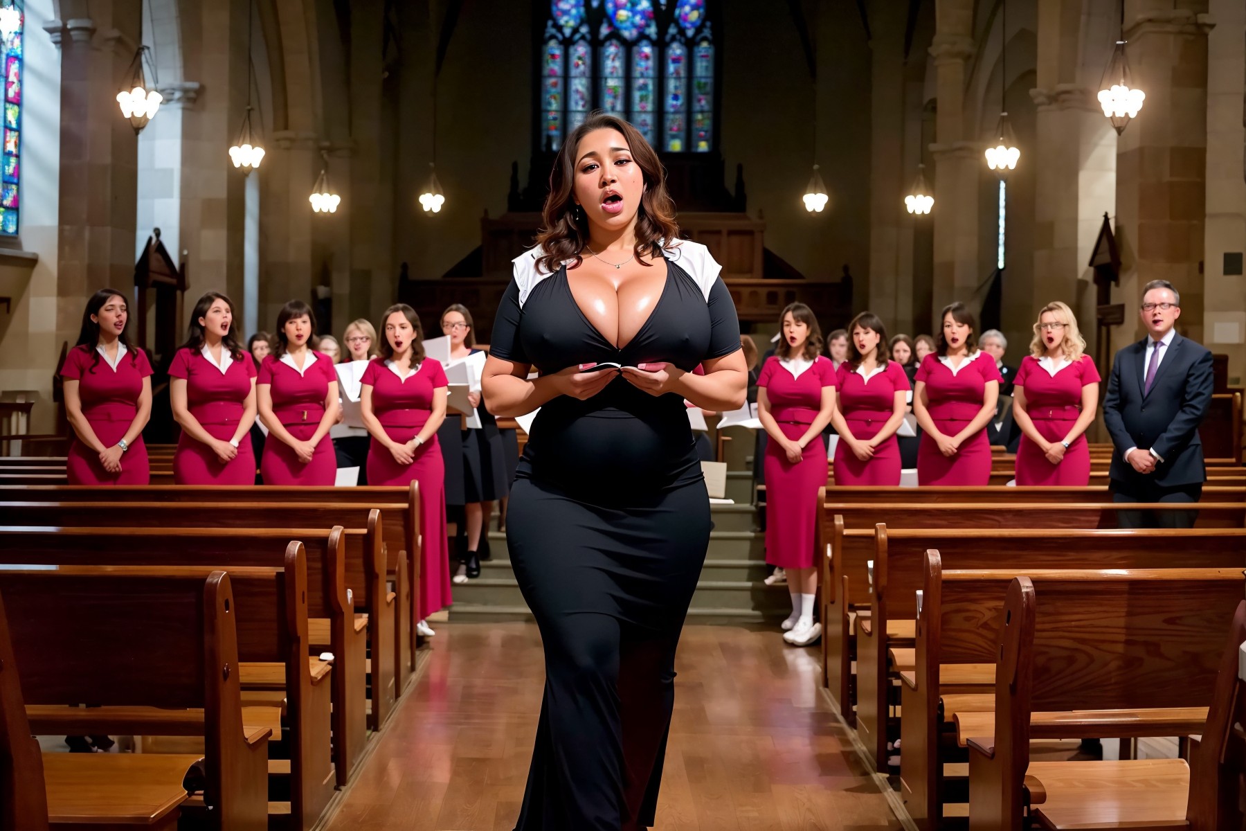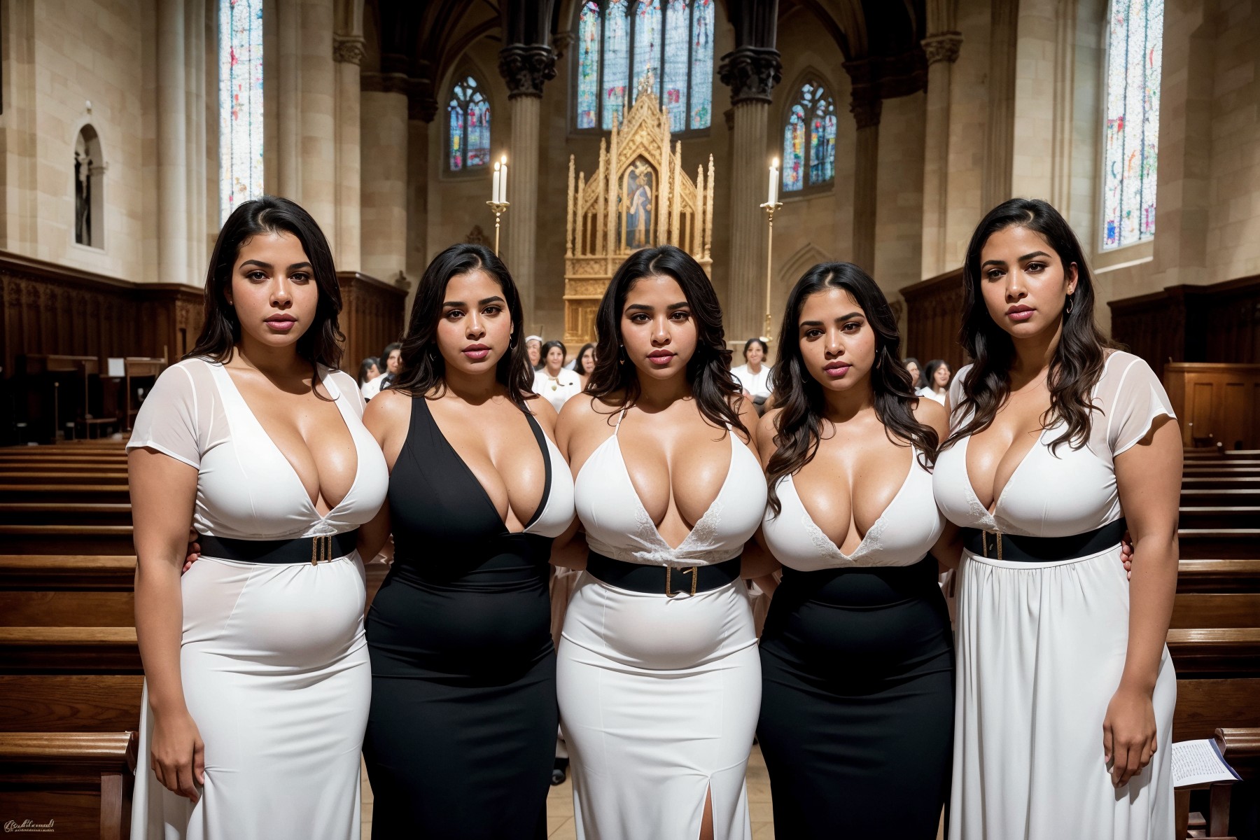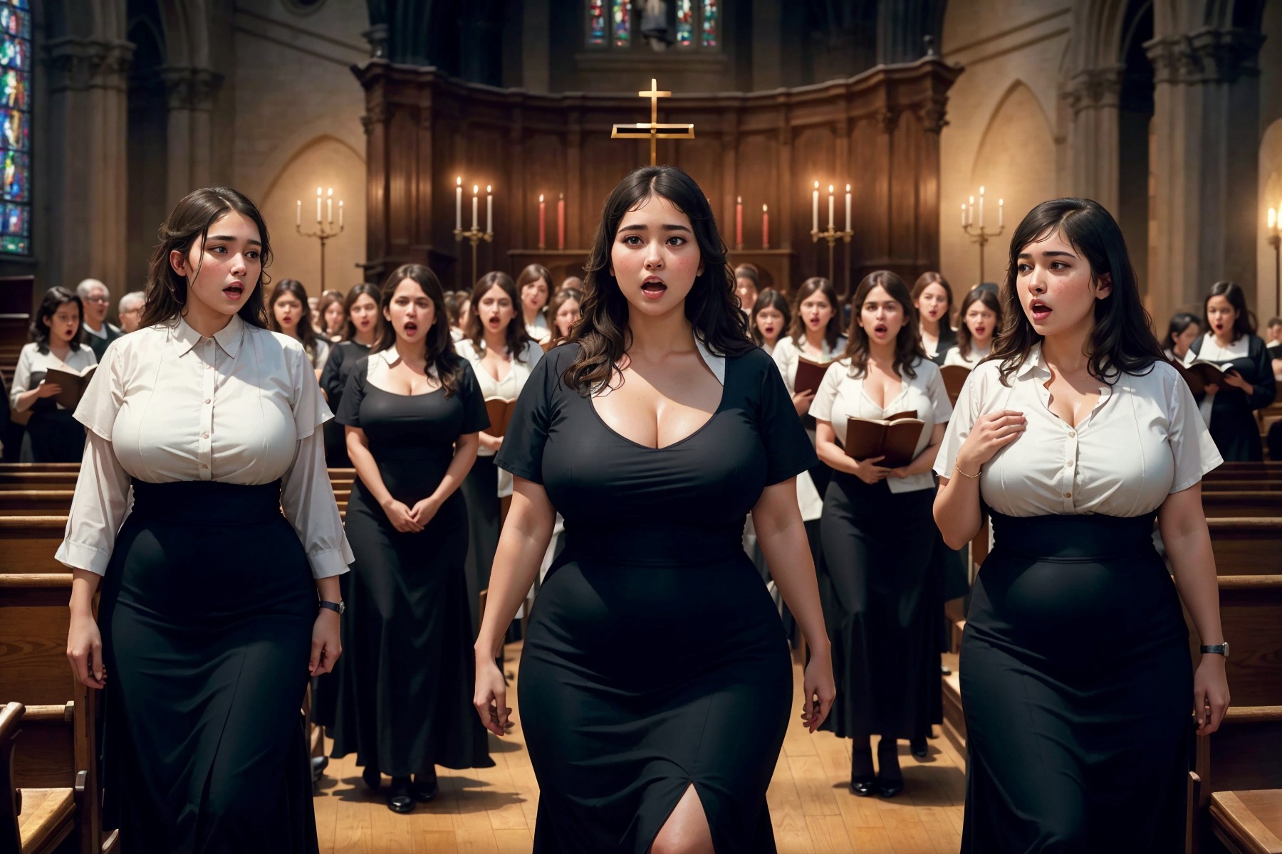 nsfw, 1girl, 2girls, 3girl, 4girls, multiple girl, (full body:1.3), church choir singing at church sanctuary, church choir gown, wear choir uniform, big breasts, chubby, cleavage, nipple, wide hip, nsfw, some of choir member opening shirt with exposed breasts, fat woman, long hair, short hair, asian, american, black woman, latina, conductor, church sanctuary, worshippers, (masterpiece:1.3), extremely high details, (best quality:1.3), absurdres, (photorealistic), realistic, hyper-detailed, ray-tracing, high resolution, sharp focus, 8k, vibrant, intricate, sharpness and clarity, lifelike, hyper_realism