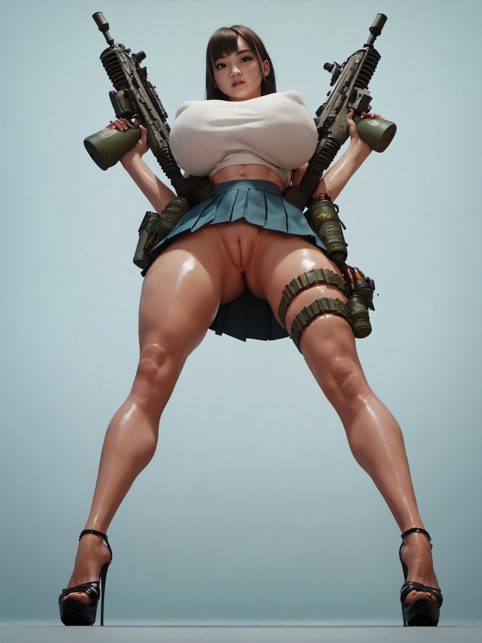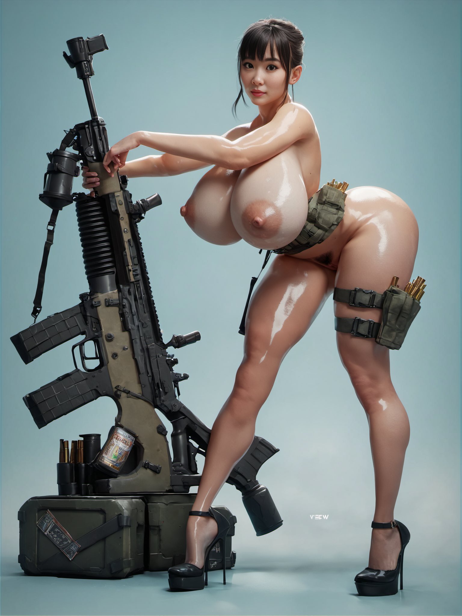 score_9, score_8_up, score_7_up, score_6_up, score_5_up, score_4_up, nsfw, full body, model shot of a naked cute Asian girl with huge breasts squatting, big nipple, cute face, puffy big areola, pubic hair, pussy, shiny skin, battle gear waist belt, holding machine gun, grenade, thigh belt, laced-up boots, spot light, looking at viewer, simple bright blue background, stacked ammunition and weapons, cartridges, missiles, military supplies, view from below, style of rpg game character, <lora:Concept Art Ultimatum Style LoRA_Pony XL v6:0.7>