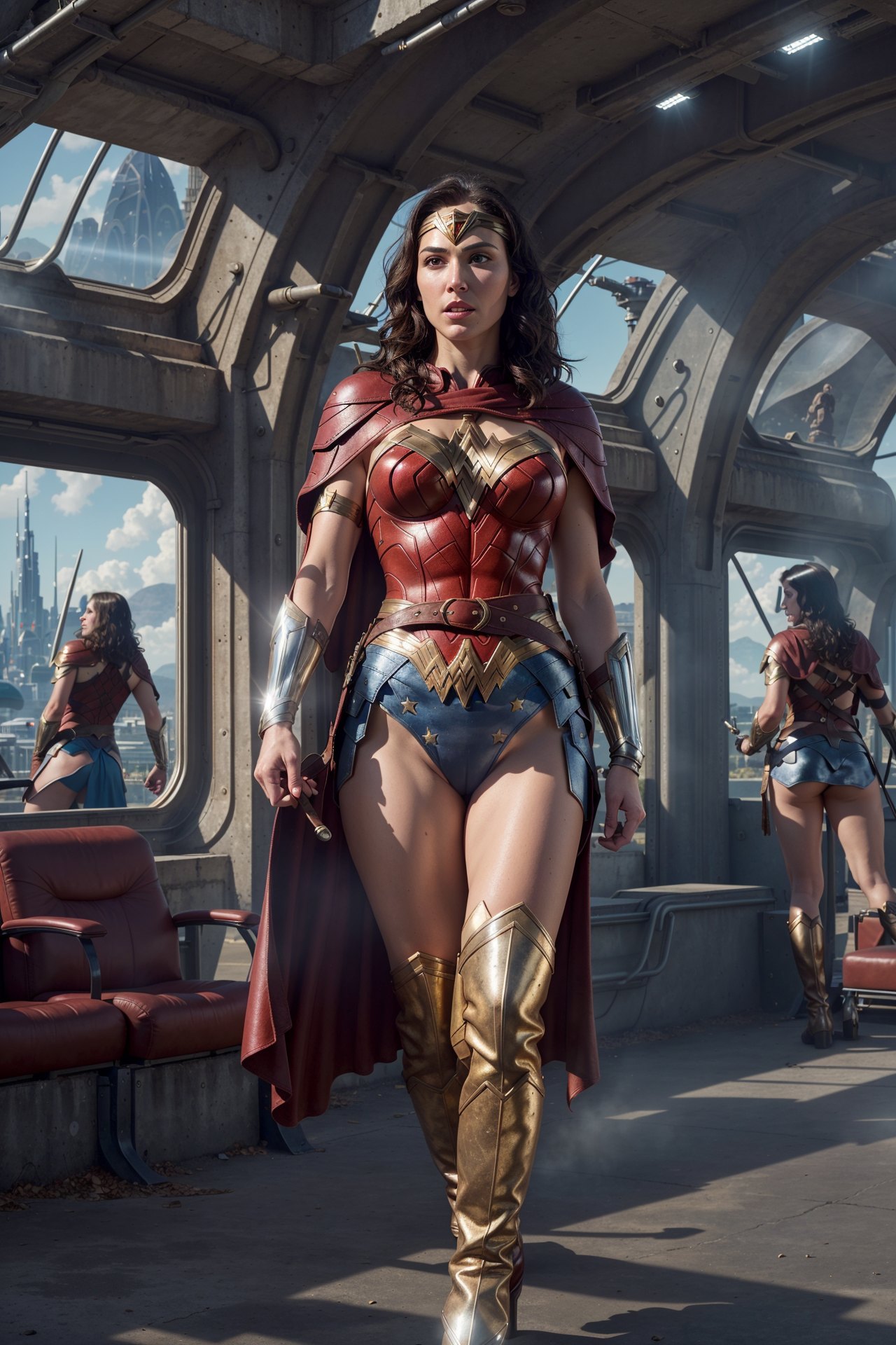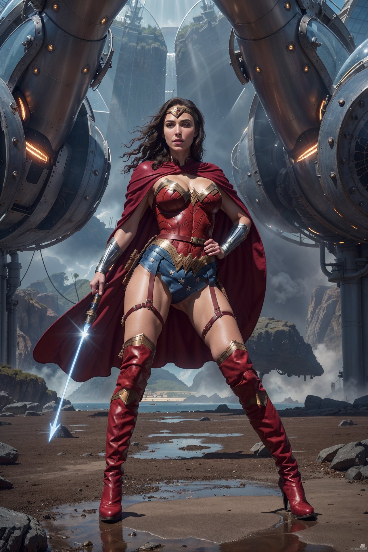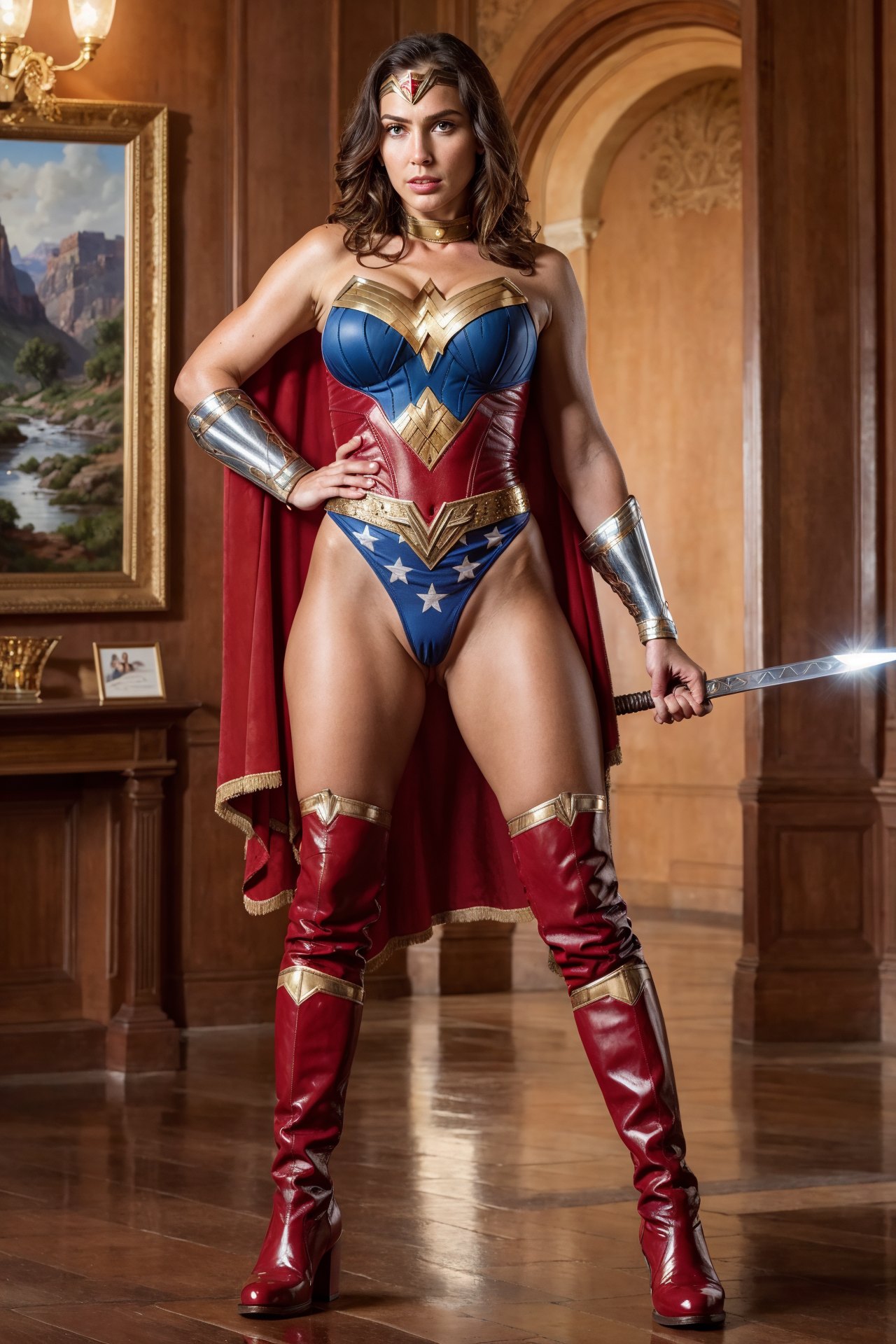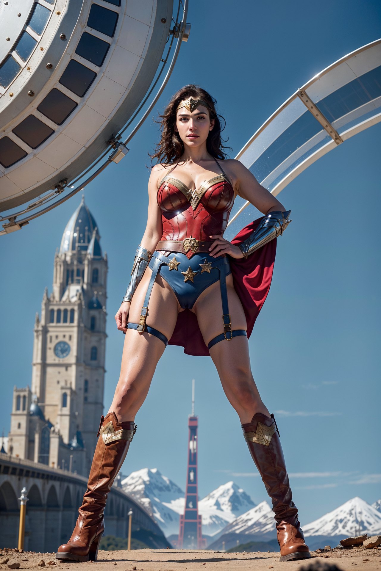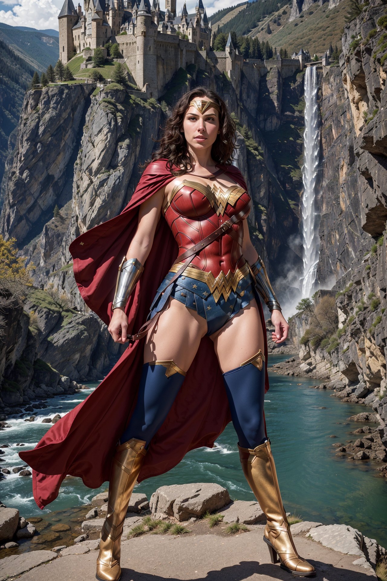 1girl, (full body:1.3), Wonder woman, movie character, wear wonder woman costume, wear cloak, girl fighter, belly leather armor, thick thigh, gigantic breasts, cleavage, leather thigh belts, gold waist belt with patterned decoration, whip, wind blowing hair, gold decoration short panty, waist-high narrow-crotch tiny panty, puffy cameltoe, pussy cleavage, pussy bulge, big pussy glans, background of (fantasy world, mountain, river, castle, sunlight), depth of field, <lora:zoom_slider_v1:-2>, (masterpiece:1.3), (best quality:1.3), extremely high details, absurdres, (photorealistic), realistic, hyper-detailed, ray-tracing, high resolution, sharp focus, 8k, vibrant, intricate, sharpness and clarity, lifelike, hyper_realism