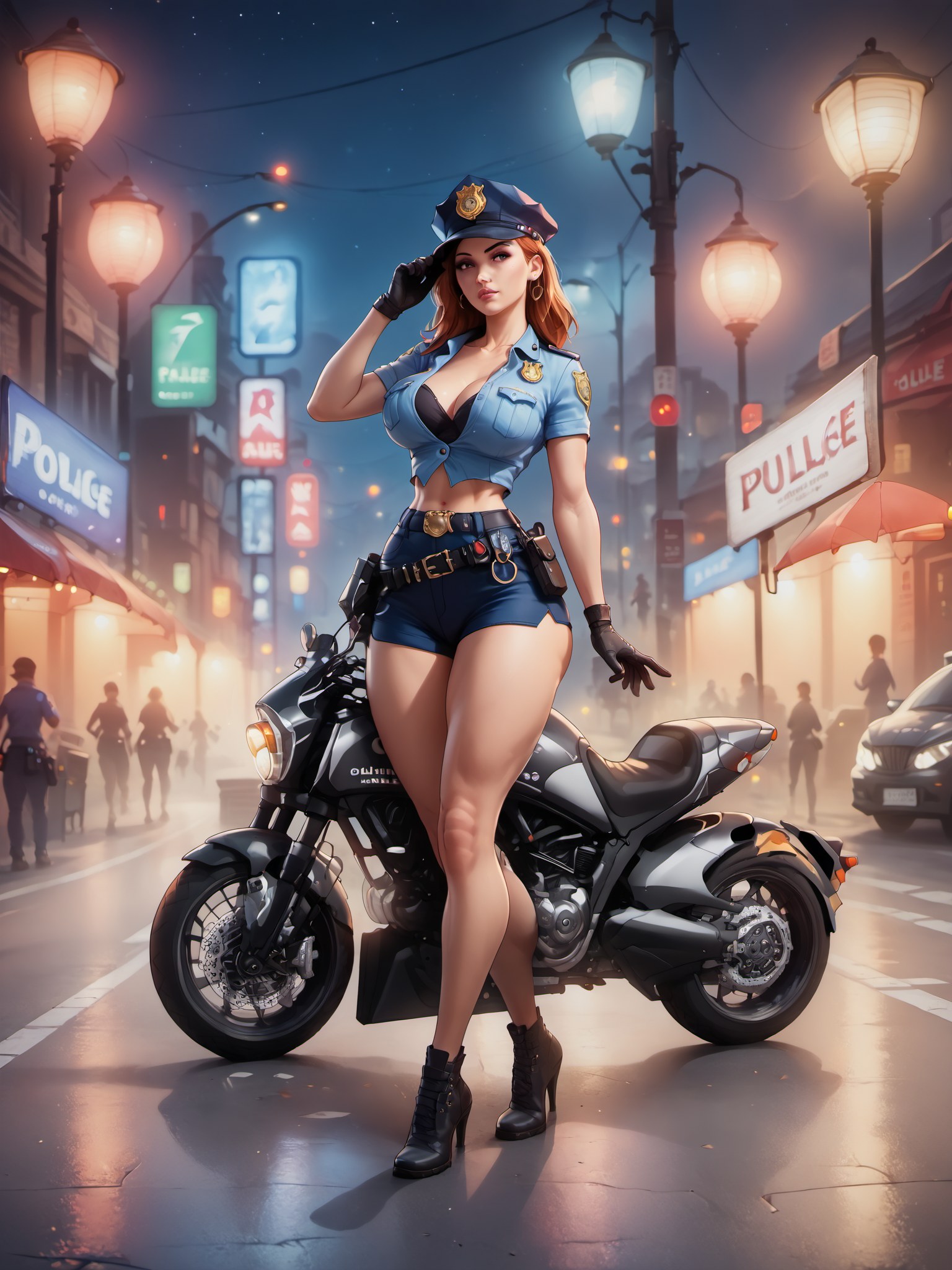 score_9, score_8_up, score_7_up, score_6_up, score_5_up, score_4_up, nsfw, full body, a naked police woman with big breasts inserting a big dildo in vagina, big dildo stuck in vagina, 1girl, cute face, wide hip, cute face, police cap, aviator sunglasses, gun holster, big puffy cameltoe, big puffy nipple, navel, shiny skin, tank-top, hairy pubic hair, armpit hair, police uniform, holding a pistol, high-heels, spot light, looking at viewer, background of police emblem design wall, view from above, style of rpg game character, <lora:Concept Art Ultimatum Style LoRA_Pony XL v6:0.7>