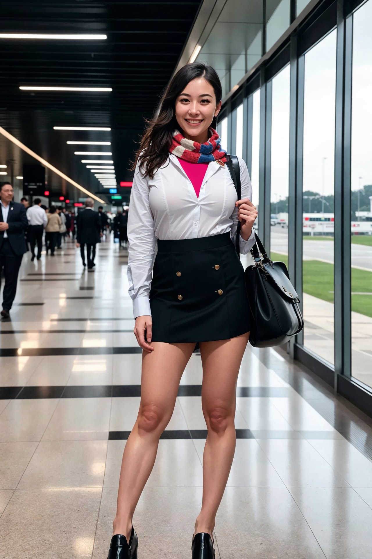 1girl, (full body:1.3), asian airline stewardess, uniform, mini-skirt, tight clothes, scarf, smile512, busty, big boobs, bare thigh, cleavage, on board, in airplane, name tag on chest, serving to customers, looking away, bent over,, (masterpiece:1.3), (best quality:1.3), extremely high details, absurdres, (photorealistic), realistic, hyper-detailed, ray-tracing, high resolution, sharp focus, 8k, vibrant, intricate, sharpness and clarity, lifelike, hyper_realism