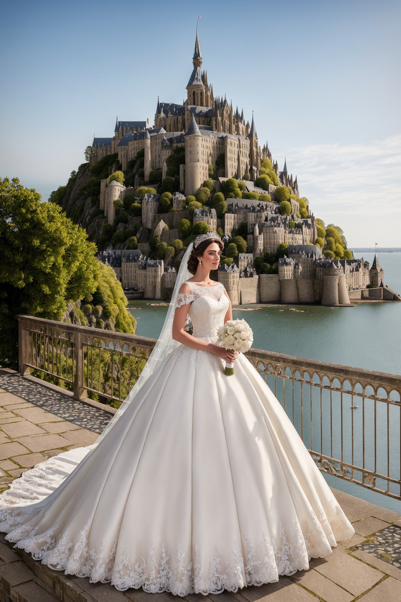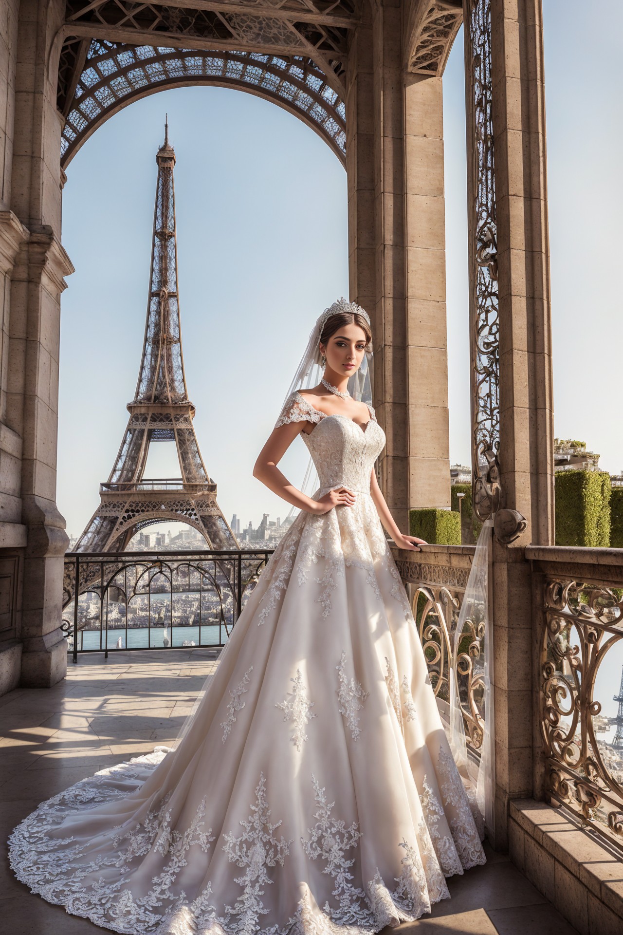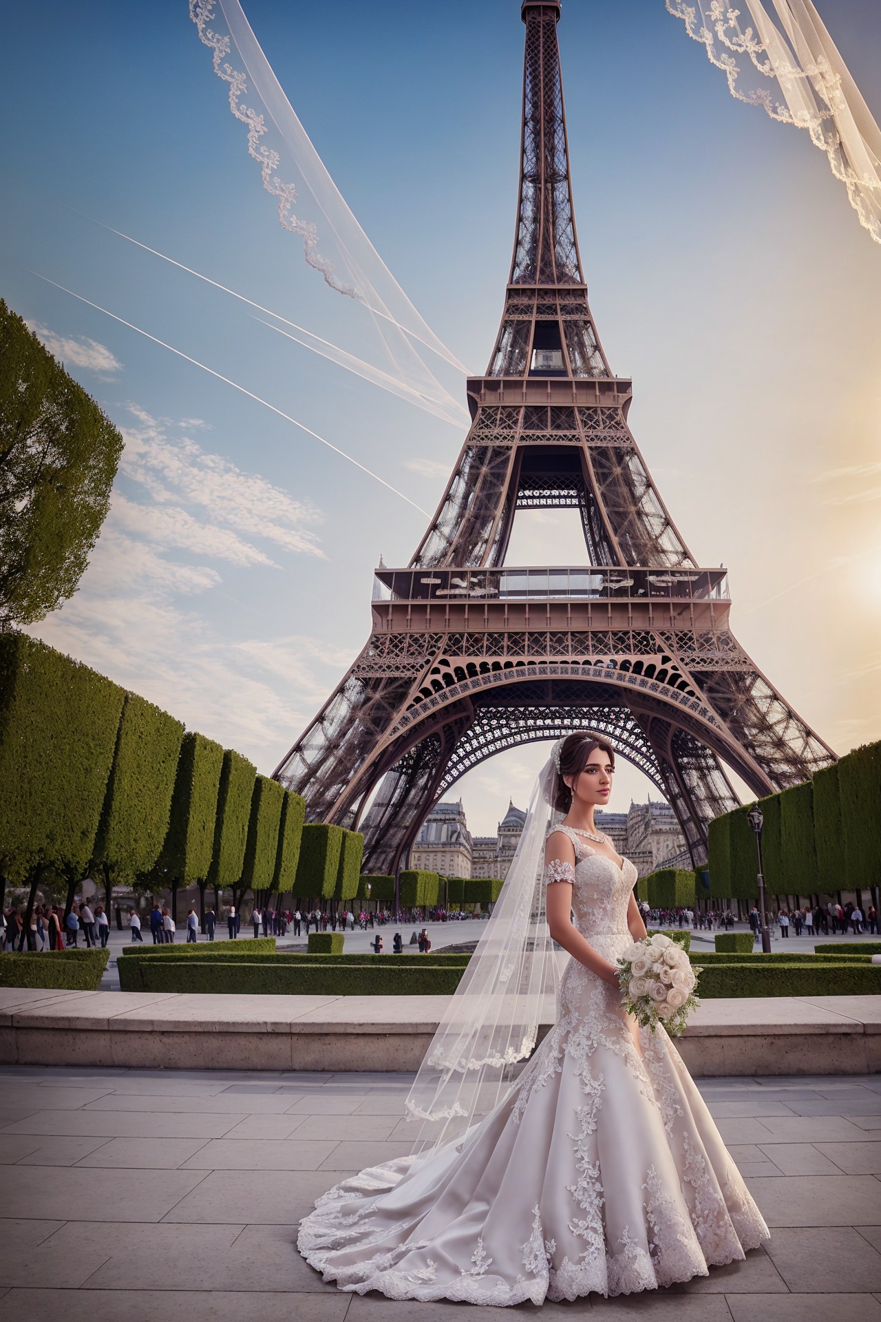 masterpiece, extremely high details, realistic, best quality, high resolution, hyper-detailed, ray-tracing, sharp focus, vibrant, intricate, sharpness and clarity, depicting a bride, background of Eiffel Tower Paris, wear laced wedding dress, aesthetic dress, face details, beautiful face, in sun_rise